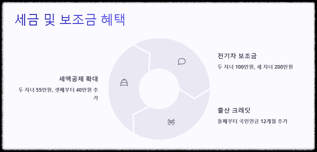 세금 혜택도 확대되어 가계 부담이 줄어듭니다. 자녀세액공제가 두 자녀 가정은 55만 원, 세 자녀 이상은 55만 원에 추가 자녀당 40만 원으로 상향되었습니다. 둘째 아이 출산 시 국민연금 가입기간이 12개월 추가 인정되는 출산 크레딧 혜택도 있어요.
