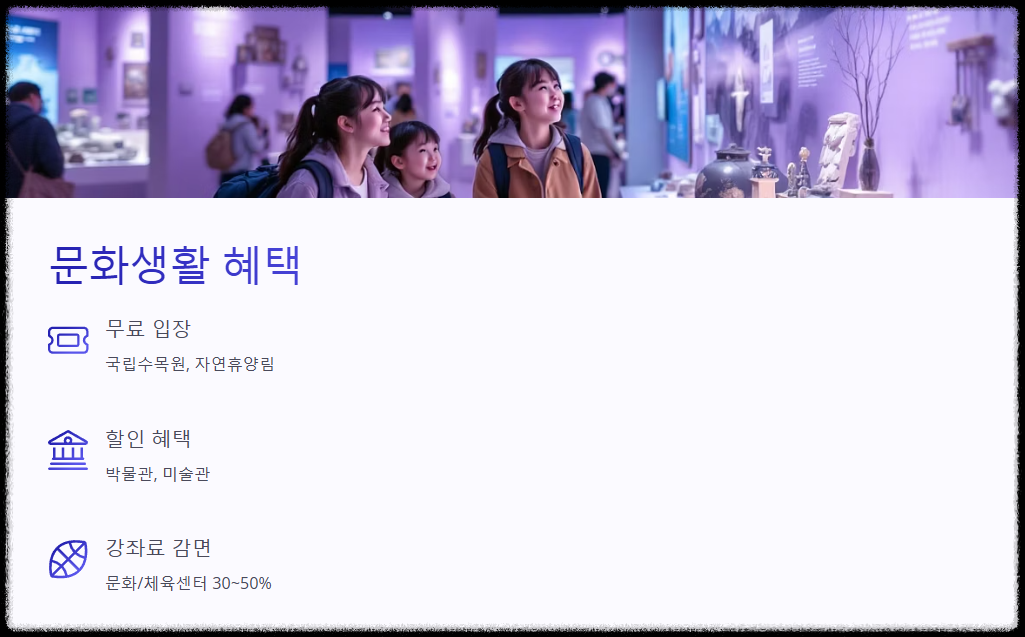 여가 생활도 더 풍요롭게 누릴 수 있습니다. 다자녀 카드 소지 시 국립수목원, 자연휴양림 등 입장이 무료이고, 박물관, 미술관 등도 할인 혜택을 받을 수 있습니다(지역별로 상이). 두 자녀 이상 가정은 시에서 운영하는 문화/체육센터 강좌료도 30~50% 감면받을 수 있어요.