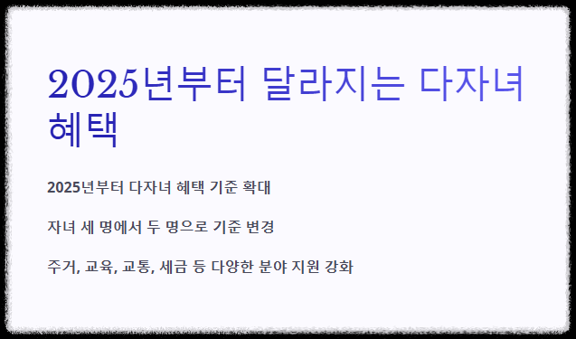 2025년부터 확대되는 다자녀 혜택은 두 자녀 이상 가정에게 실질적인 도움이 될 것으로 기대됩니다. 아이 키우기 쉽지 않은 요즘, 이런 정책들이 육아 부담을 조금이나마 덜어주길 바라봅니다.