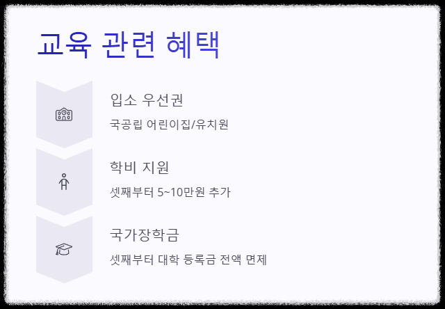 아이들의 교육은 부모님의 가장 큰 관심사일 텐데요, 다자녀 가정을 위한 교육 혜택도 풍성해졌습니다. 두 자녀 이상 가정은 국공립 어린이집 및 유치원 입소 우선권을 받게 됩니다. 입학 경쟁이 치열한 요즘, 이 혜택만으로도 큰 도움이 될 거예요. 셋째 이상 자녀가 유치원에 다닐 경우, 지자체마다 5~10만 원의 추가 학비를 지원합니다. 만 12세 이하 아동을 둔 가정은 아이돌봄 서비스를 신청할 수 있으며, 특히 세 자녀 이상 가정은 우선 제공 대상입니다. 이제 다자녀 가정은 형제자매가 같은 학교에 다닐 수 있도록 우선 배정됩니다. 자녀 교육과 등하교 관리가 한결 수월해지겠죠? 국가장학금도 두 자녀 가정은 소득에 따라 대학 등록금 일부 지원, 셋째 이상 자녀는 소득과 관계없이 대학 등록금 전액 면제 혜택이 있습니다. "우리 애들 대학 보낼 땐 어쩌나..." 걱정하셨다면 이제 한시름 놓으셔도 됩니다!