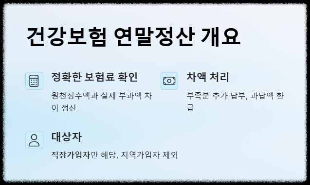 건강보험 연말정산은 직장가입자의 건강보험료가 정확하게 부과되었는지를 확인하고 차액을 정산하는 절차입니다. 연중 월급에서 원천징수한 건강보험료와 실제 부과해야 할 보험료에 차이가 발생하면, 이를 정산해 추가 납부하거나 환급받게 됩니다.