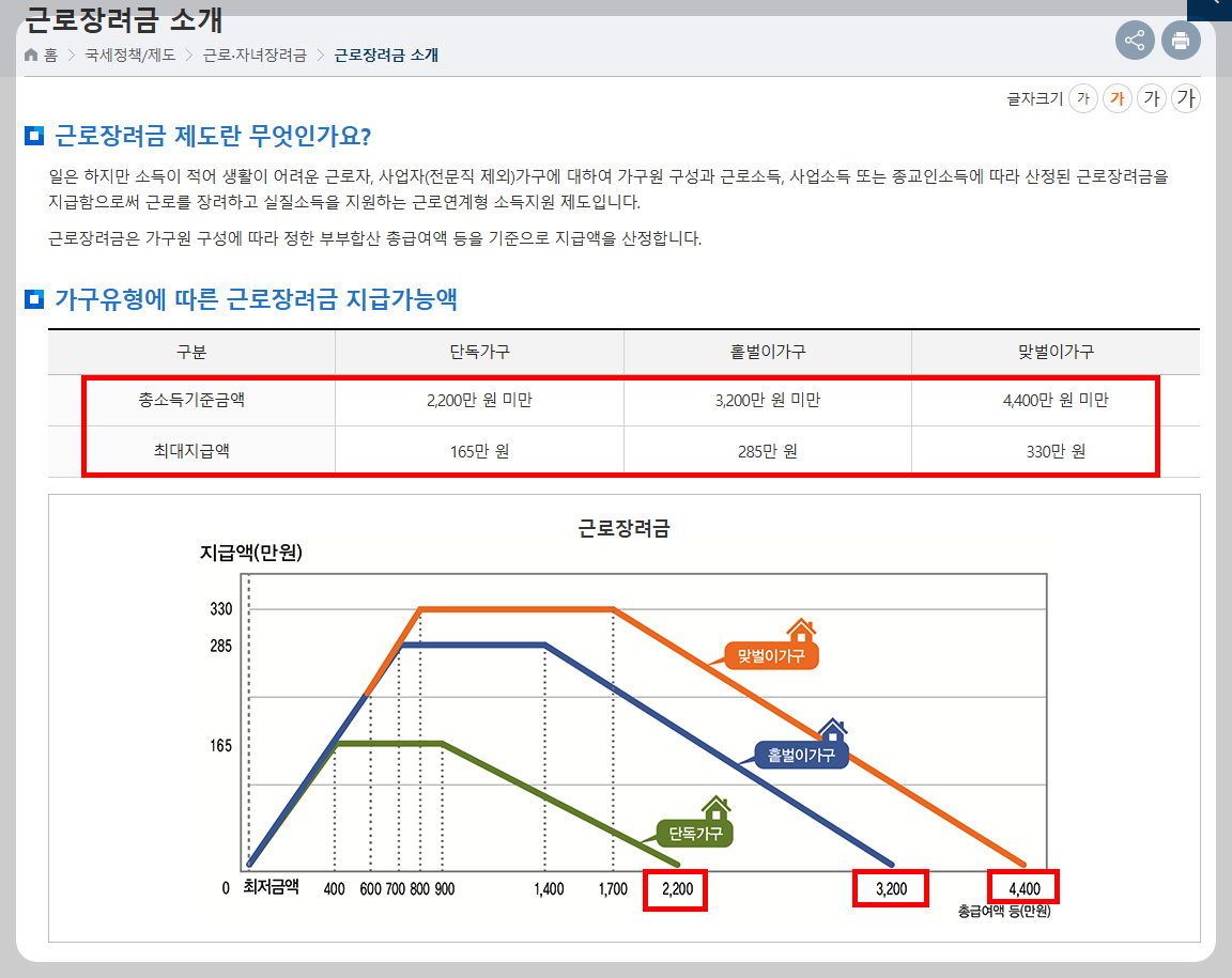 가구 유형별 소득 요건과 최대 지급 금액 정리