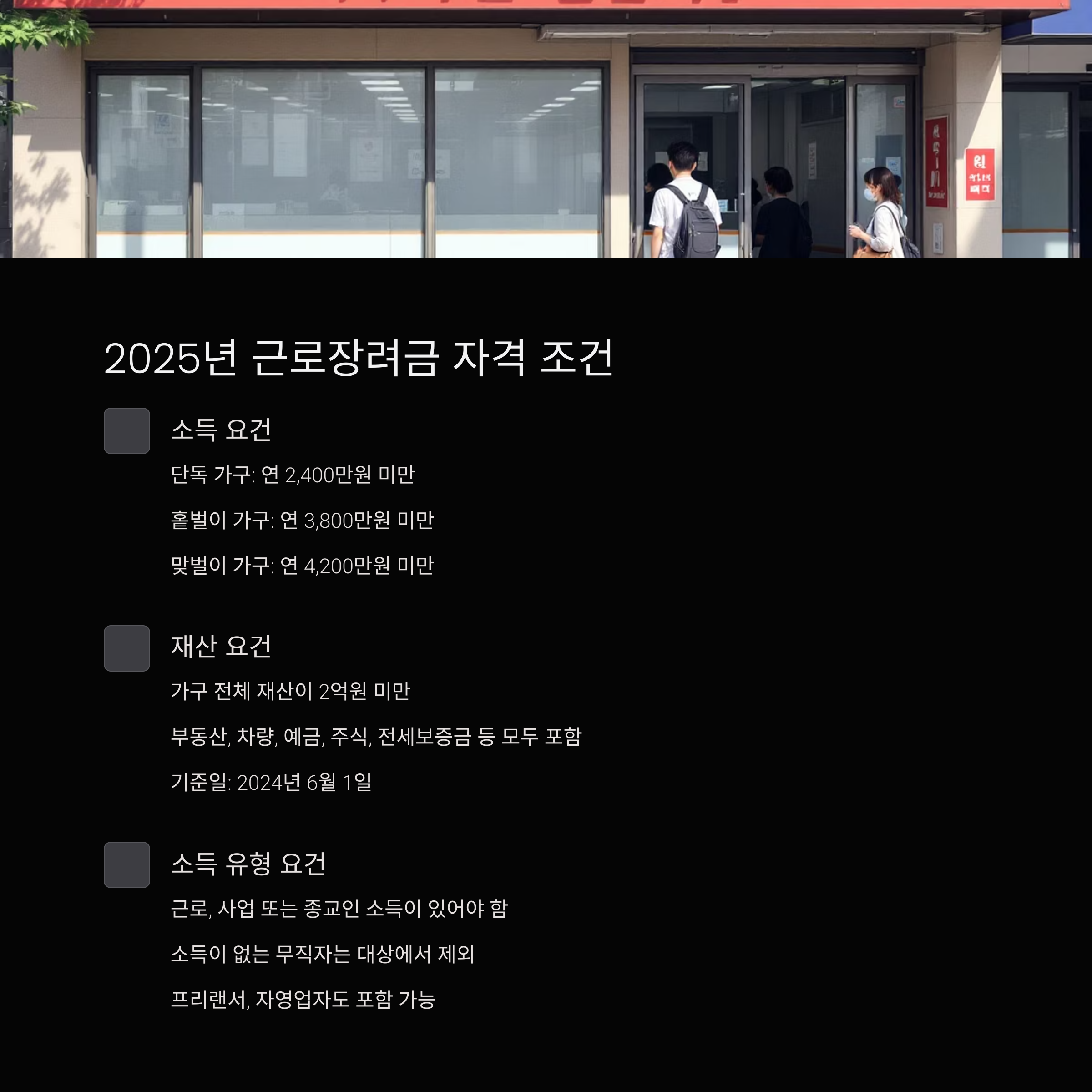 근로장려금을 받기 위해서는 소득, 재산, 가구 유형 세 가지 요건을 모두 충족해야 합니다.