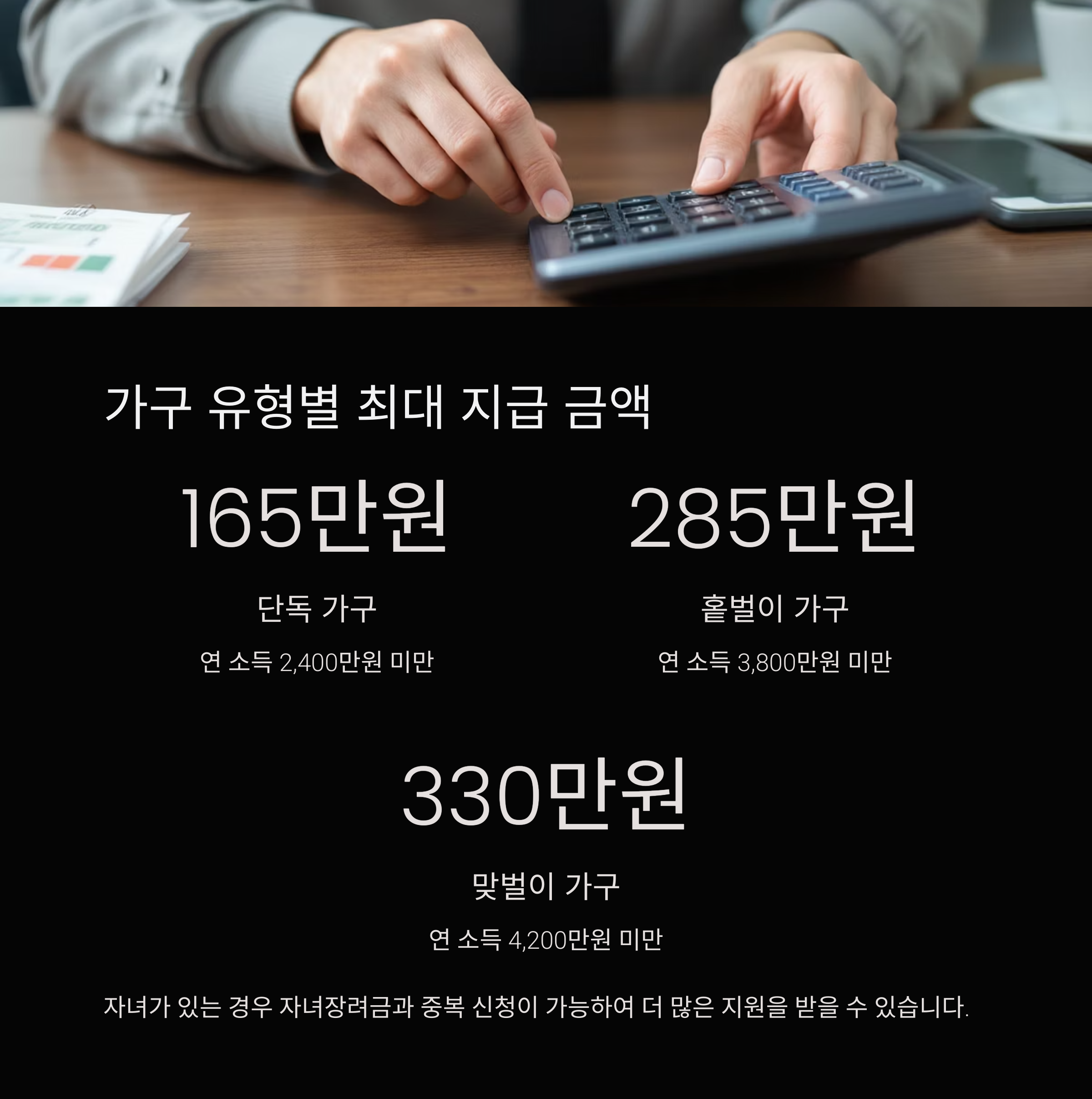 | 가구유형 | 연 소득 기준 | 최대 지급 금액 |
