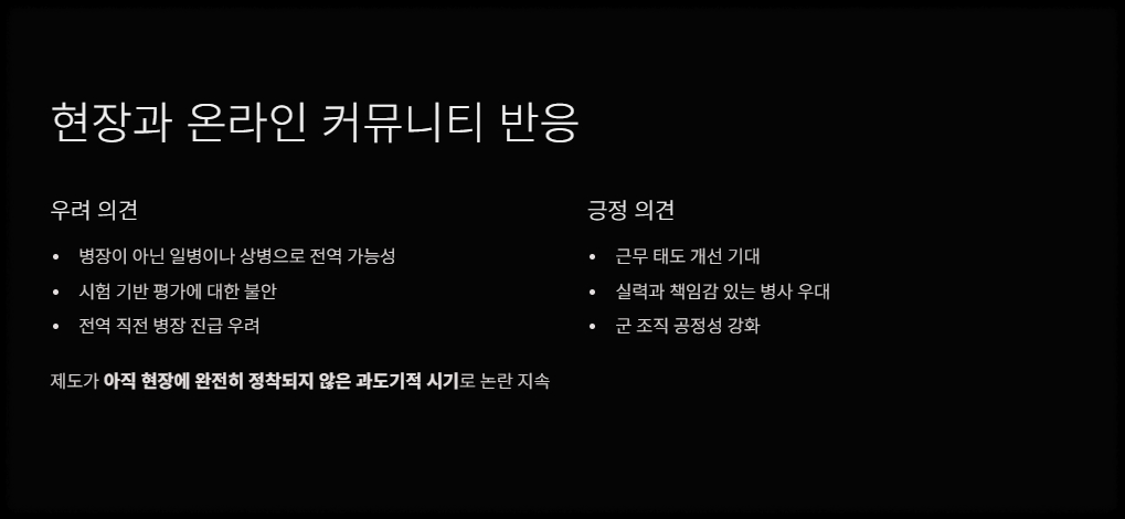 "시험 기반의 평가 방식이면 공부 못 하는 친구는 병장도 못 다는 거냐"는 반응이 있었으며