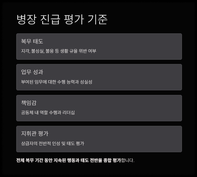 병장 진급은 복무 태도, 업무 성과, 책임감 등 다양한 요소를 종합 평가한 뒤