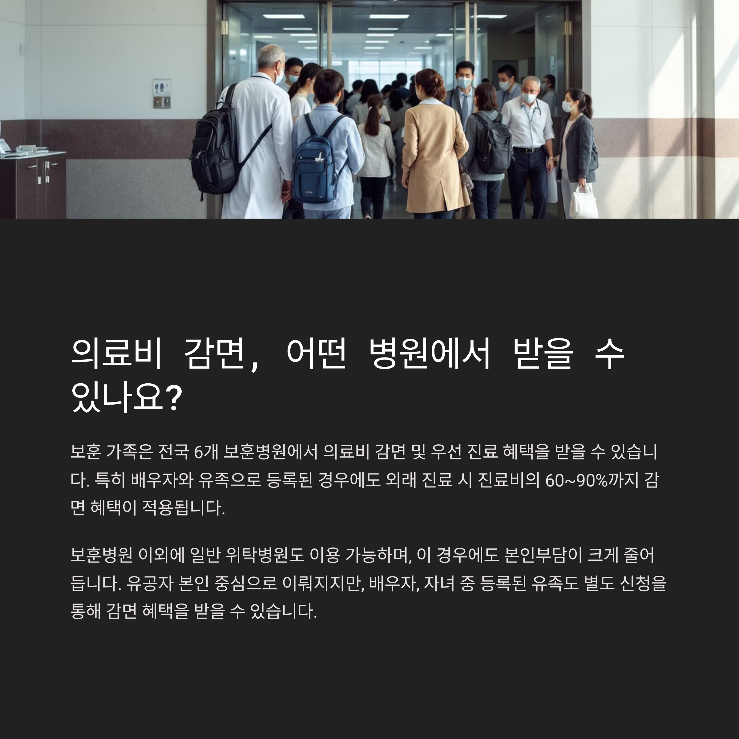 의료 지원은 유공자 본인 중심으로 이뤄지지만, 배우자, 자녀 중 등록된 유족도 별도 신청을 통해 감면 혜택을 받을 수 있으므로 병원 이용 전 반드시 본인의 감면 등록 상태를 확인하는 것이 중요합니다.