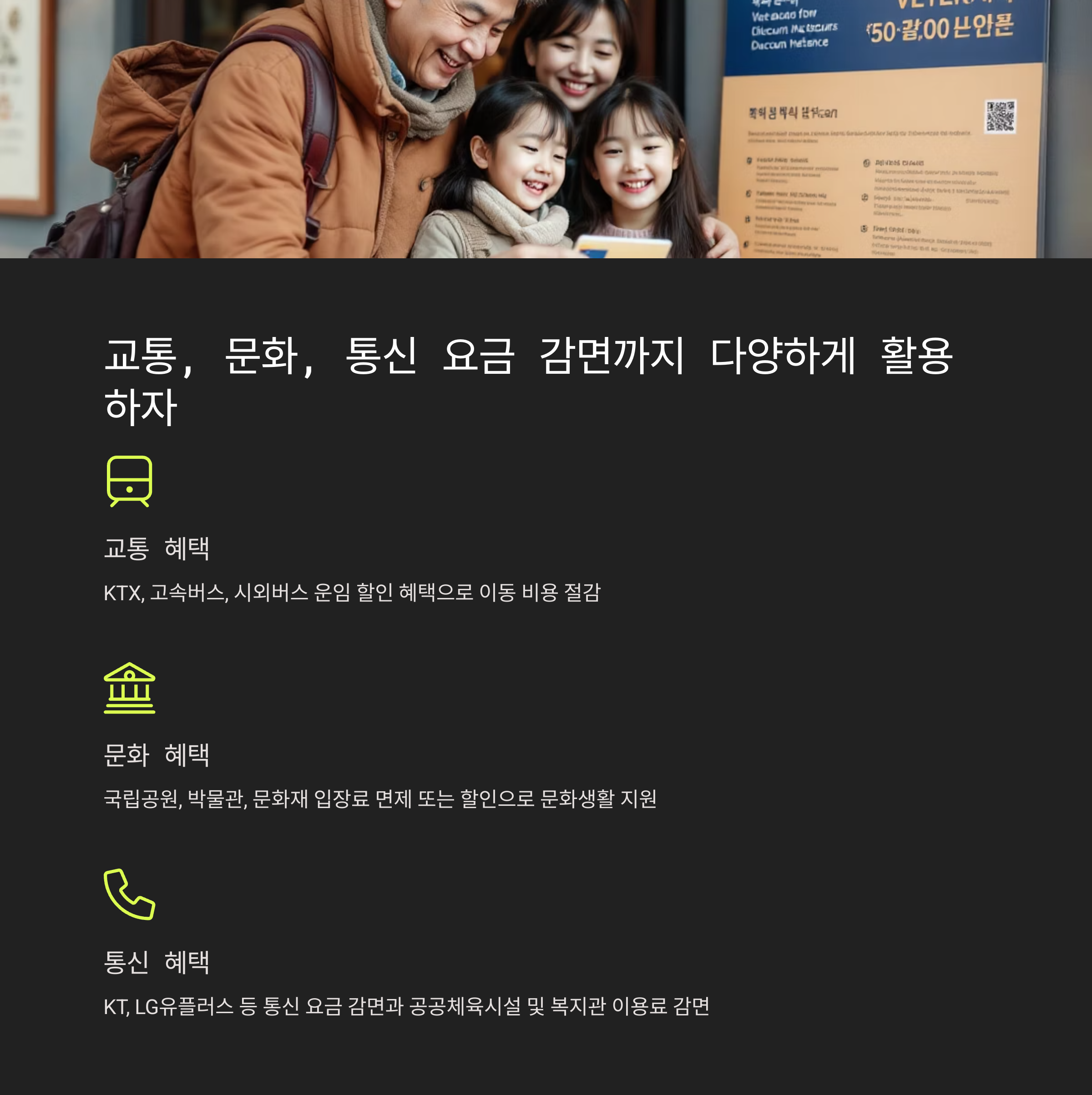 교통, 문화, 통신 요금 감면까지 다양하게 활용하자