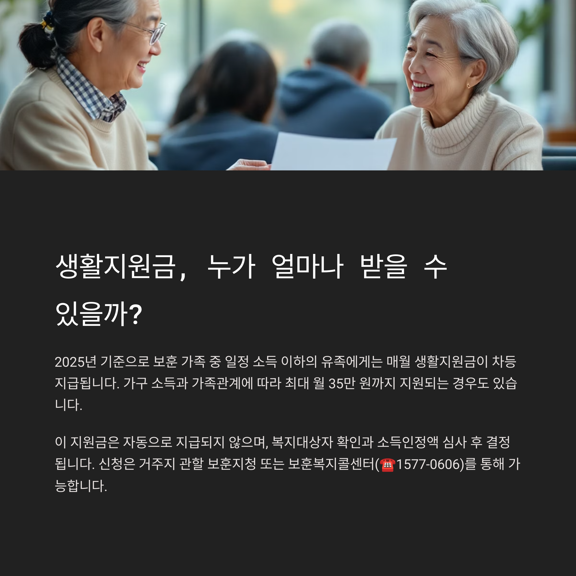 이 지원금은 자동으로 지급되는 것이 아니라, 복지대상자 확인과 소득인정액 심사 후 결정되며, 신청은 거주지 관할 보훈지청 또는 보훈복지콜센터(☎1577-0606)를 통해 할 수 있습니다.