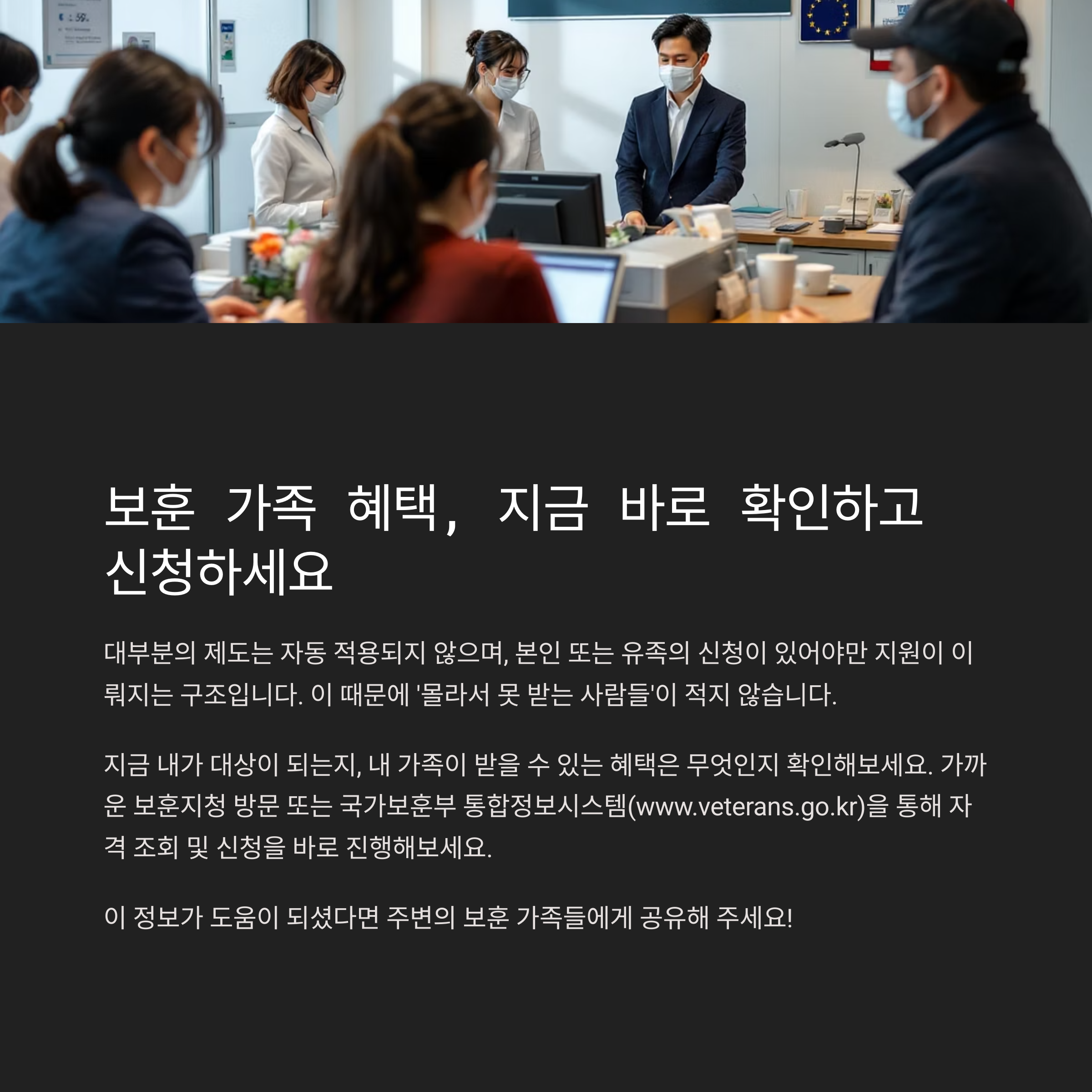지금 내가 대상이 되는지, 내 가족이 받을 수 있는 혜택은 무엇인지 확인해보는 것이 가장 먼저 해야 할 일입니다. 이를 위해 가까운 보훈지청 방문, 또는 국가보훈부 통합정보시스템(www.veterans.go.kr)을 통해 자격 조회 및 신청을 바로 진행해보세요.