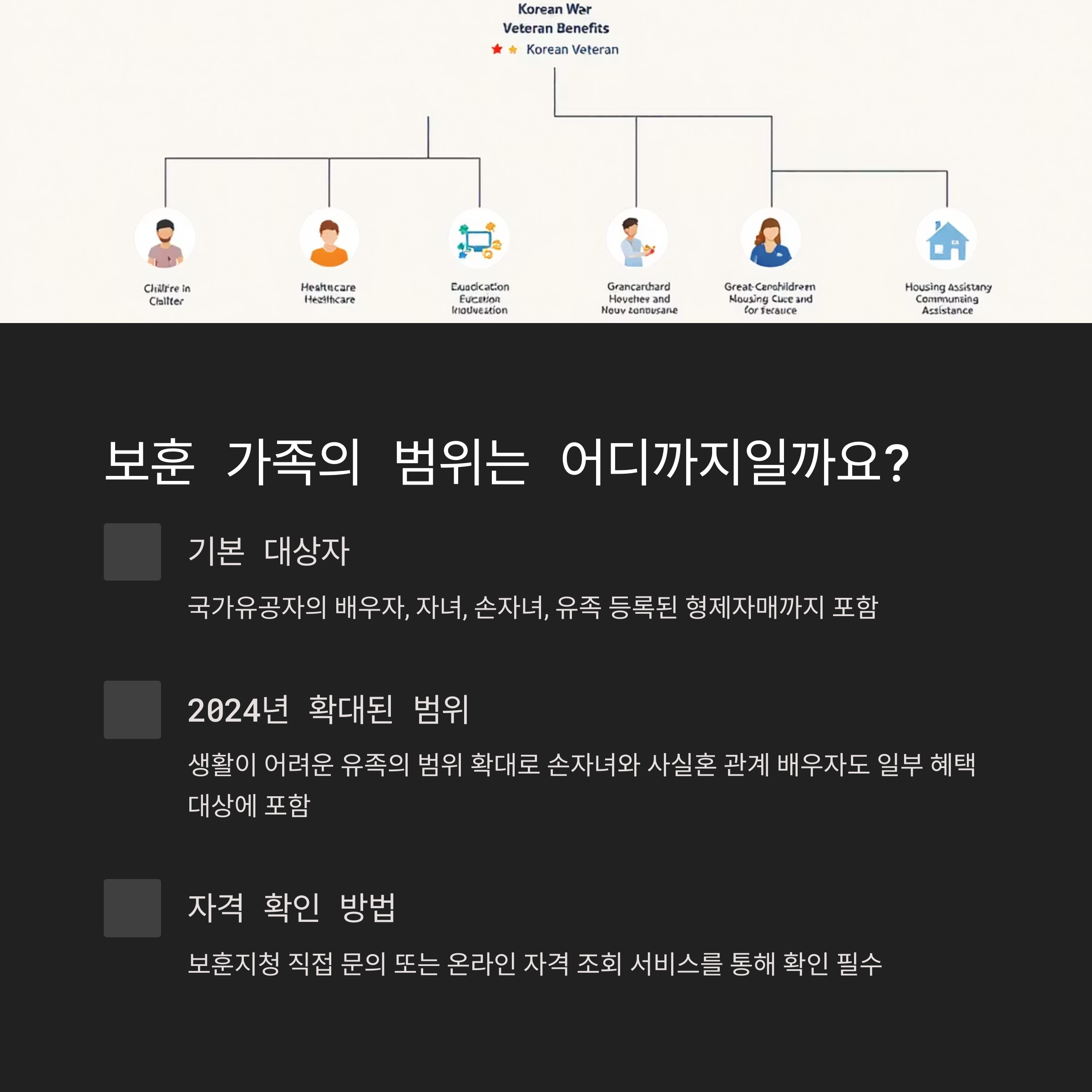 이처럼 보훈 가족의 범위는 법령에 따라 계속 조정되므로, ‘나는 해당 안 되겠지’라는 추측보다는 보훈지청에 직접 문의하거나 온라인 자격 조회 서비스를 이용해 확인하는 것이 필수입니다.