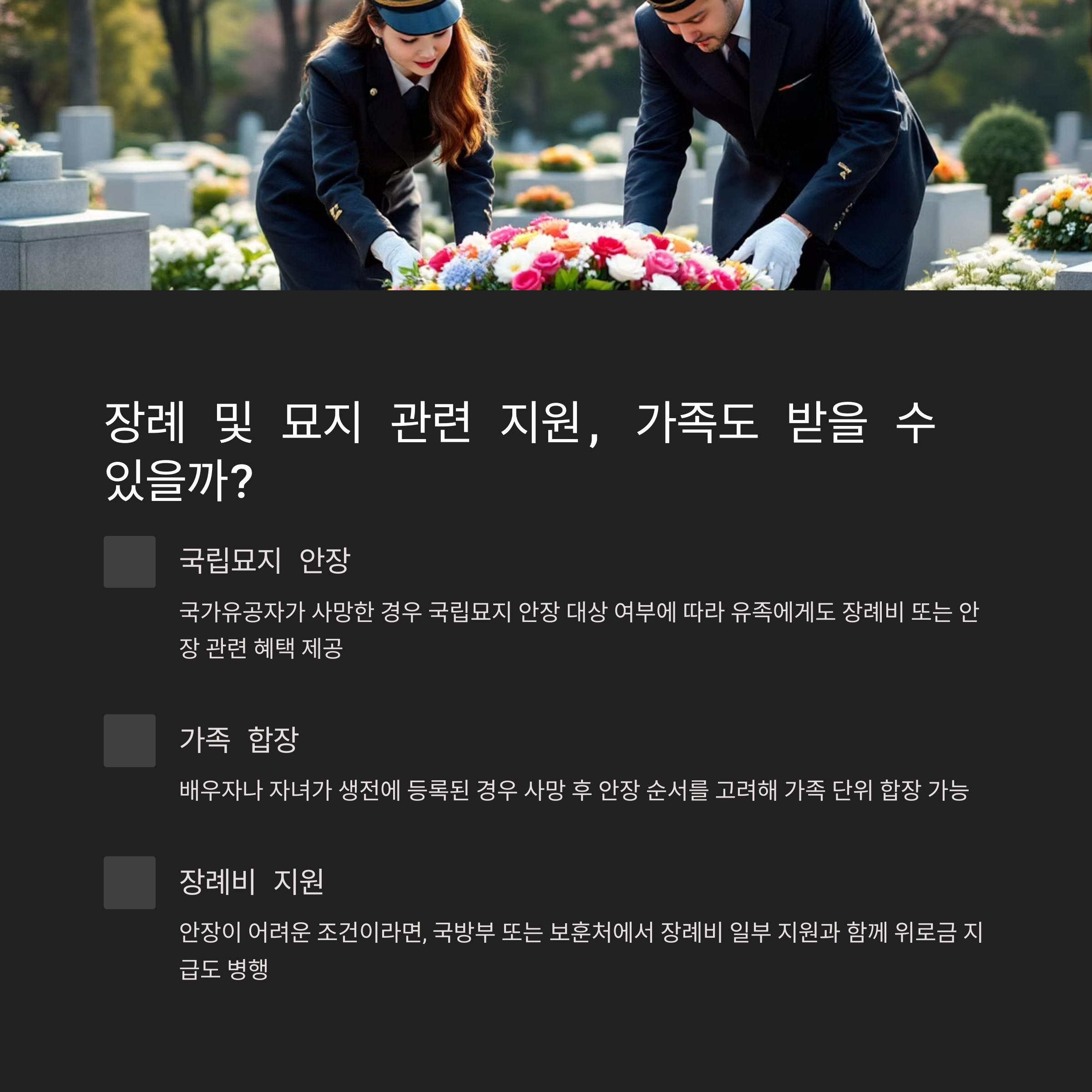 국가유공자가 사망한 경우 국립묘지 안장 대상 여부에 따라 유족에게도 장례비 또는 안장 관련 혜택이 제공됩니다. 특히 배우자나 자녀가 생전에 등록된 경우에는 사망 후 안장 순서를 고려해 가족 단위 합장이 가능한 경우도 있습니다.