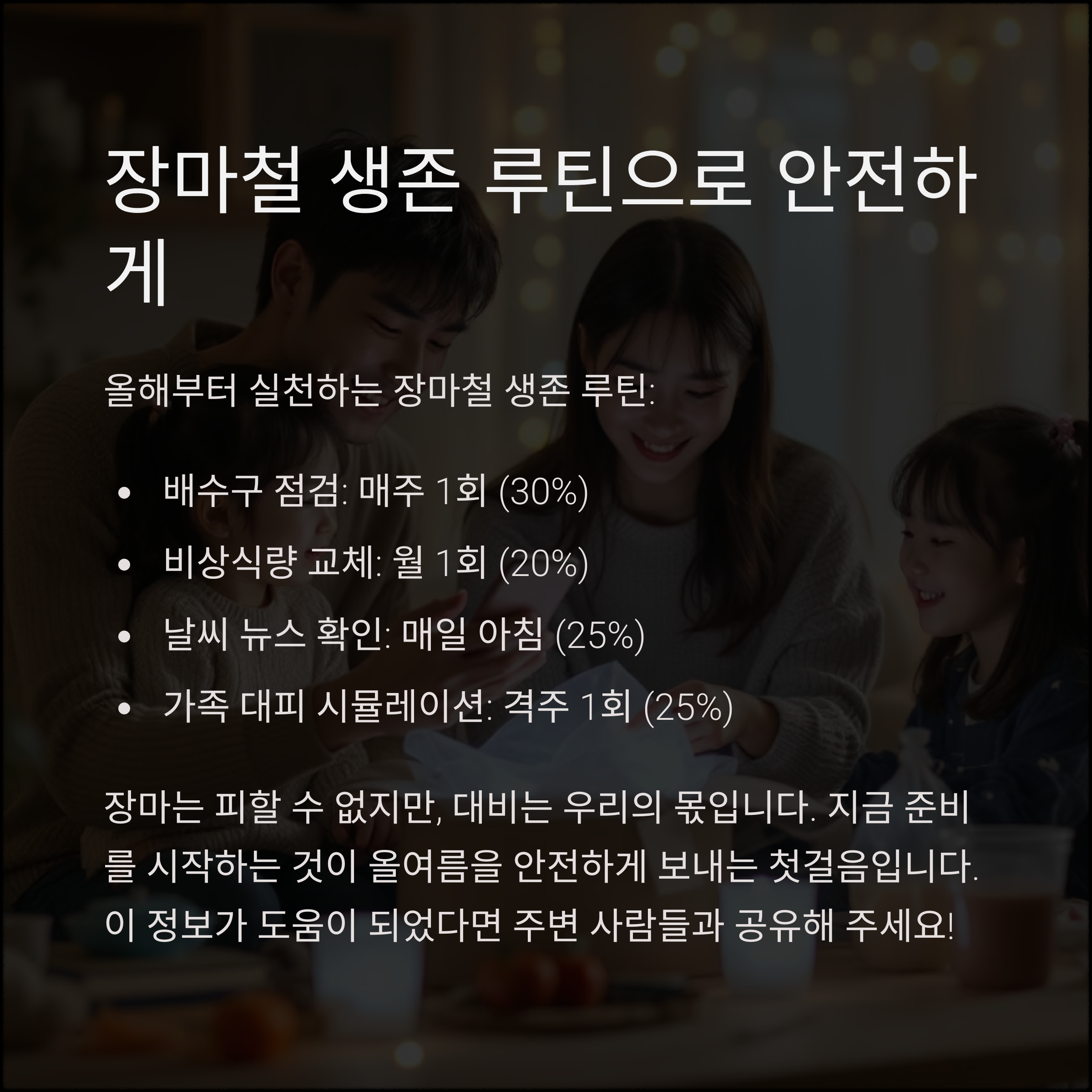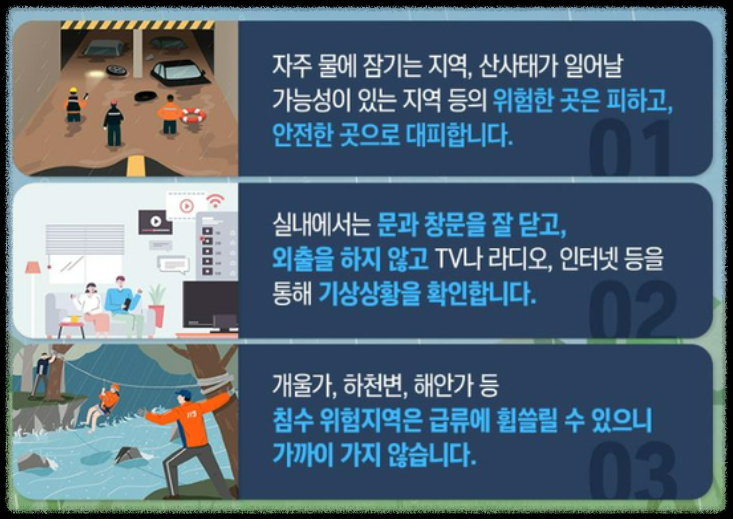 장마철을 안전하게 보내기 위해선 상황별로 철저히 준비하는 것이 핵심입니다