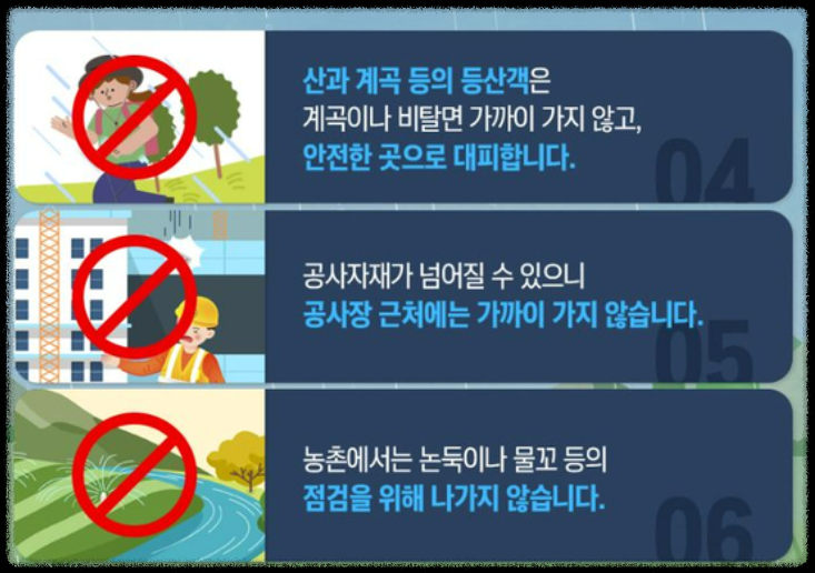 | 하천 범람 | 접근 금지, 실시간 뉴스 확인 | 휴대용 라디오, 긴급용 식량 |