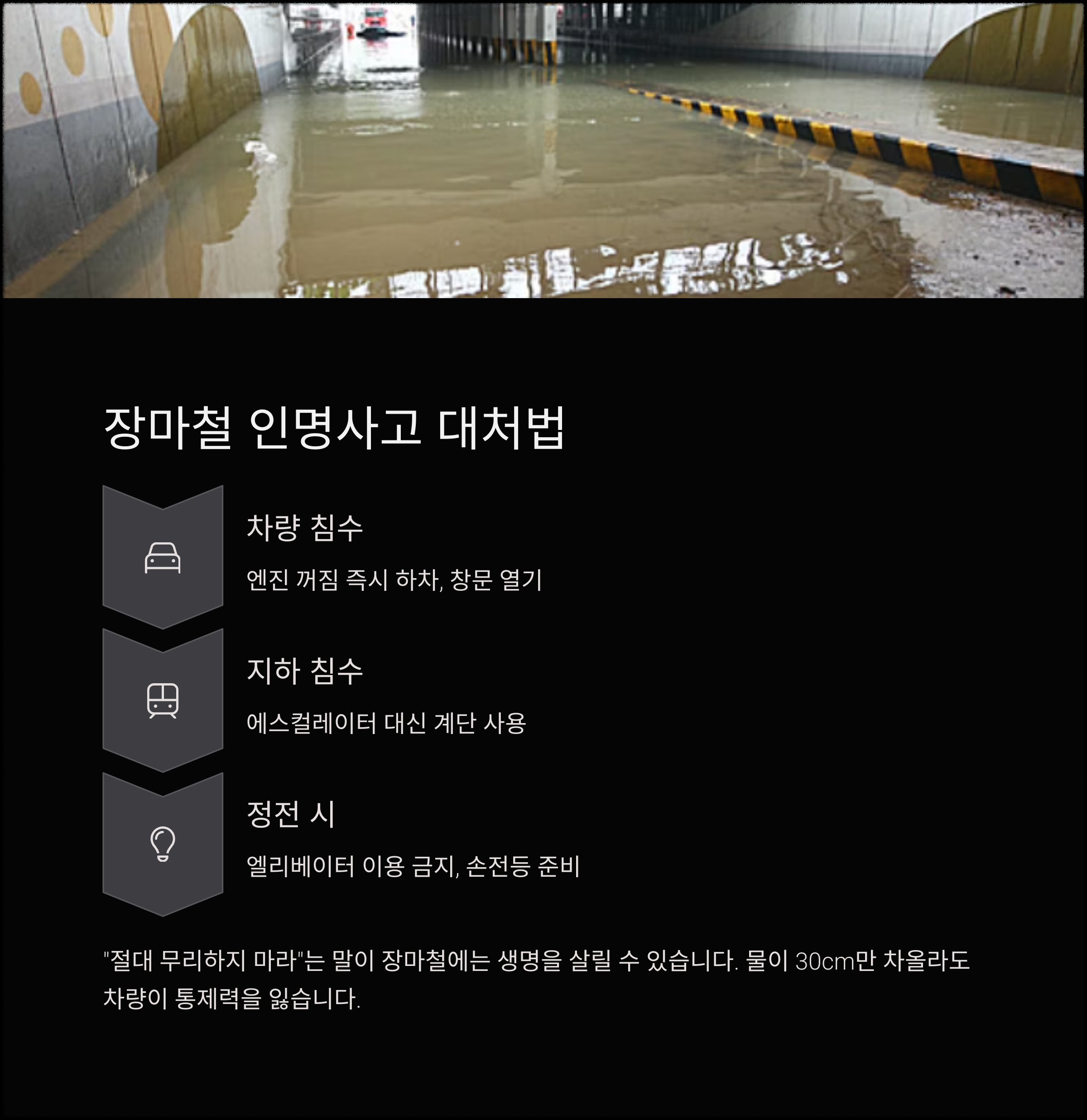 | 지하 침수 | 에스컬레이터 대신 계단 사용 |