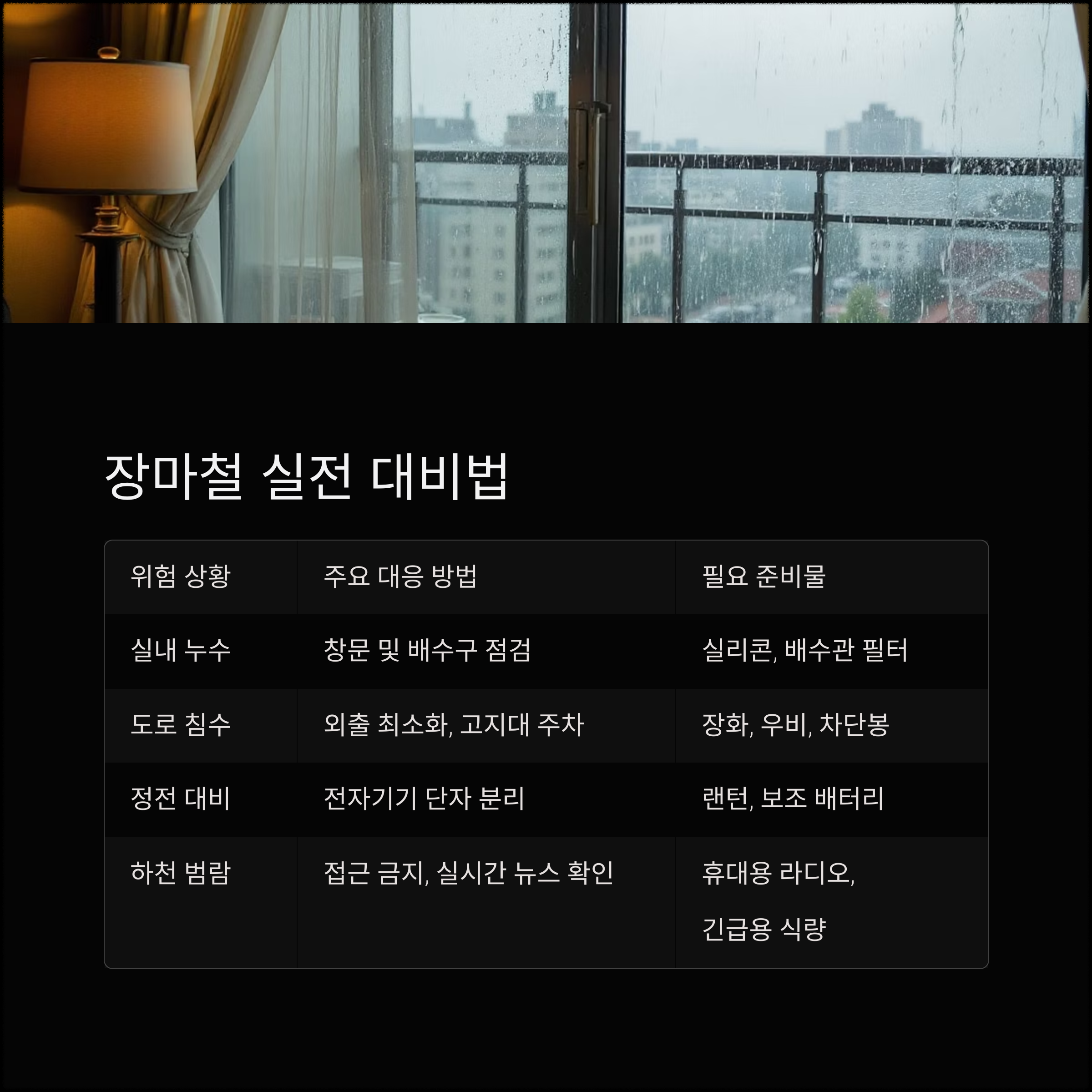 | 도로 침수 | 외출 최소화, 고지대 주차 | 장화, 우비, 차단봉 |