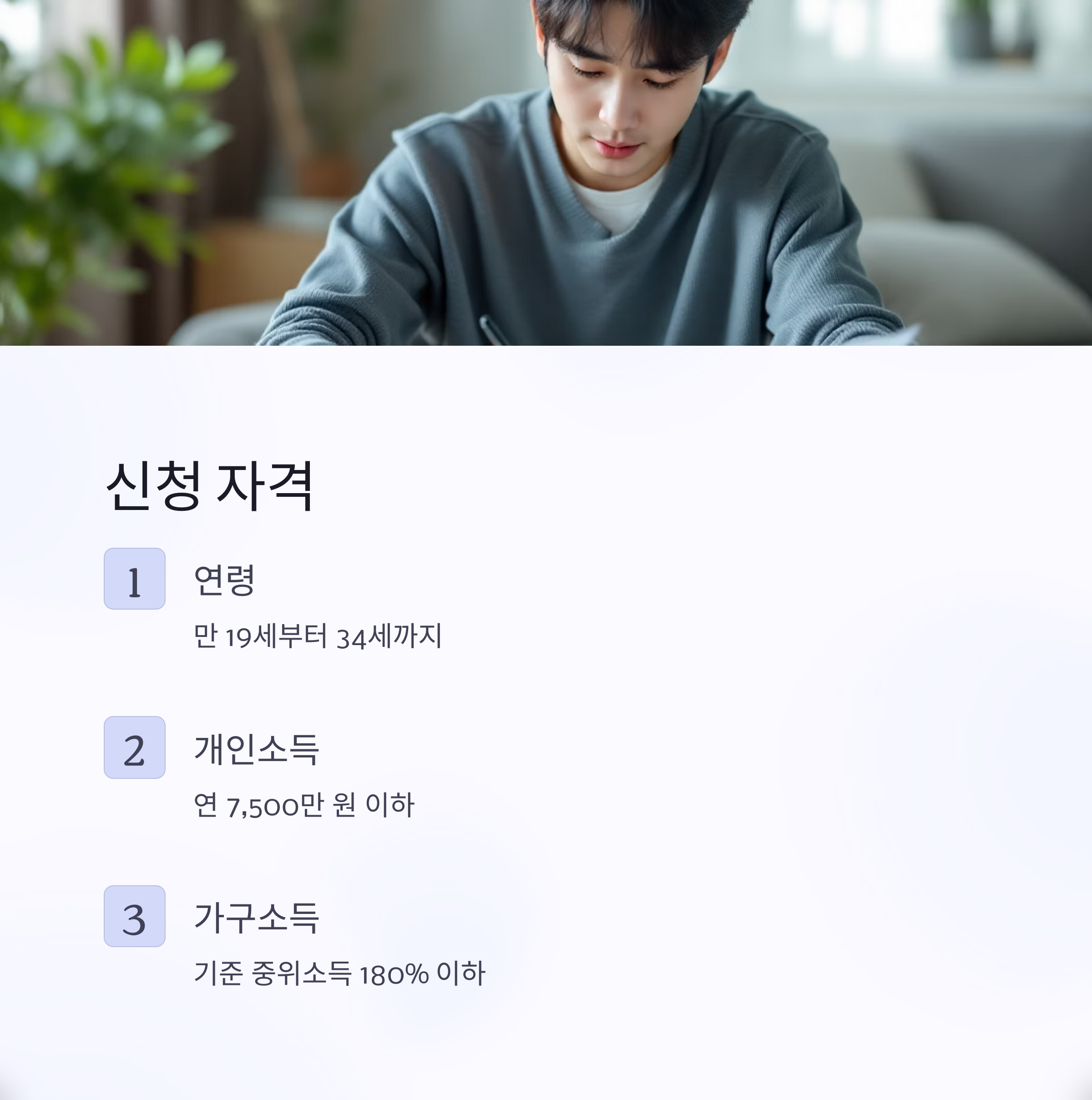 청년도약계좌는 만 19세부터 34세까지의 청년을 대상으로 하며, 아래 3가지 조건을 충족해야 신청할 수 있습니다.
