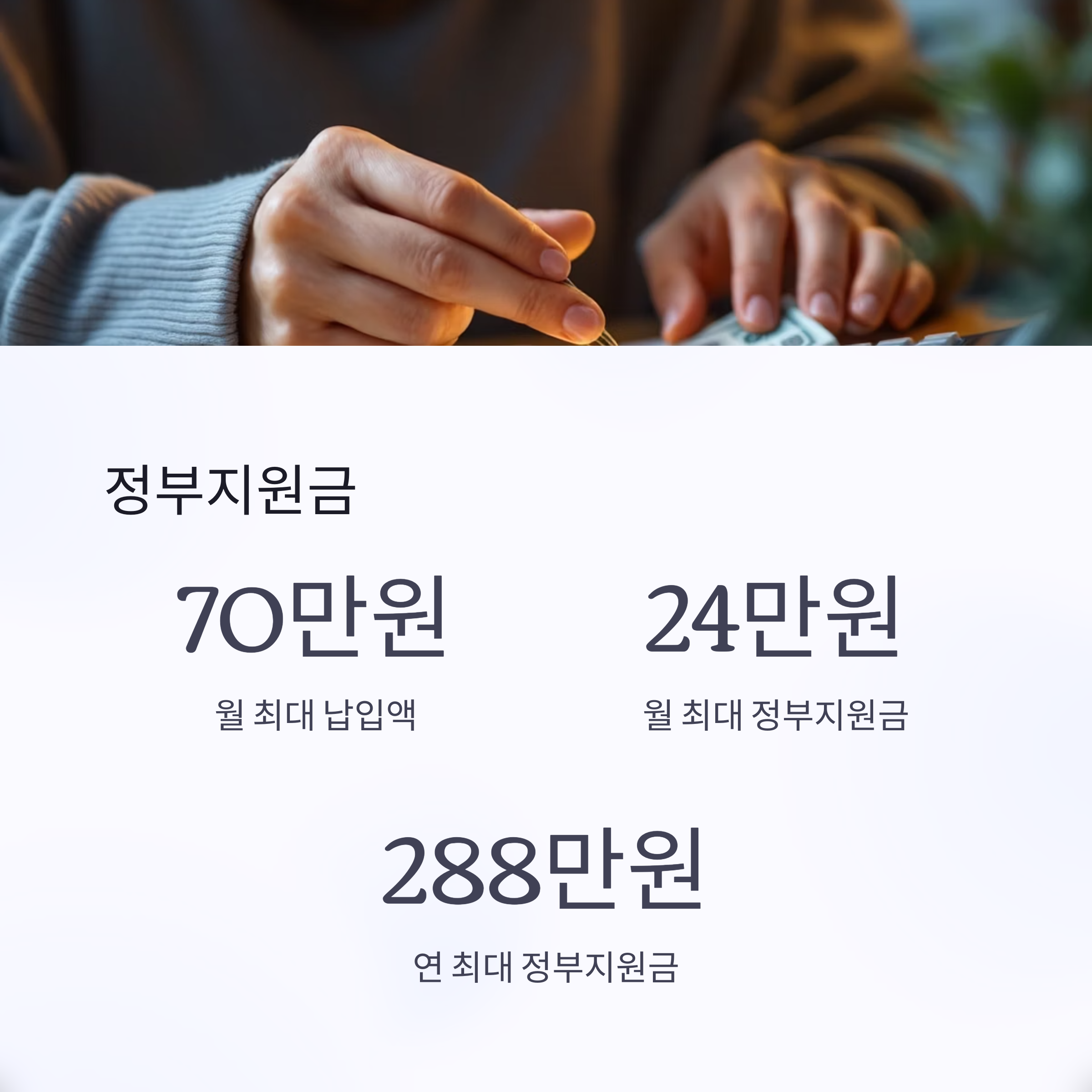 납입액은 월 최대 70만 원까지 가능하며, 정부가 소득에 따라 월 최대 24만 원(연 최대 288만 원)을 추가로 매칭해줍니다.
