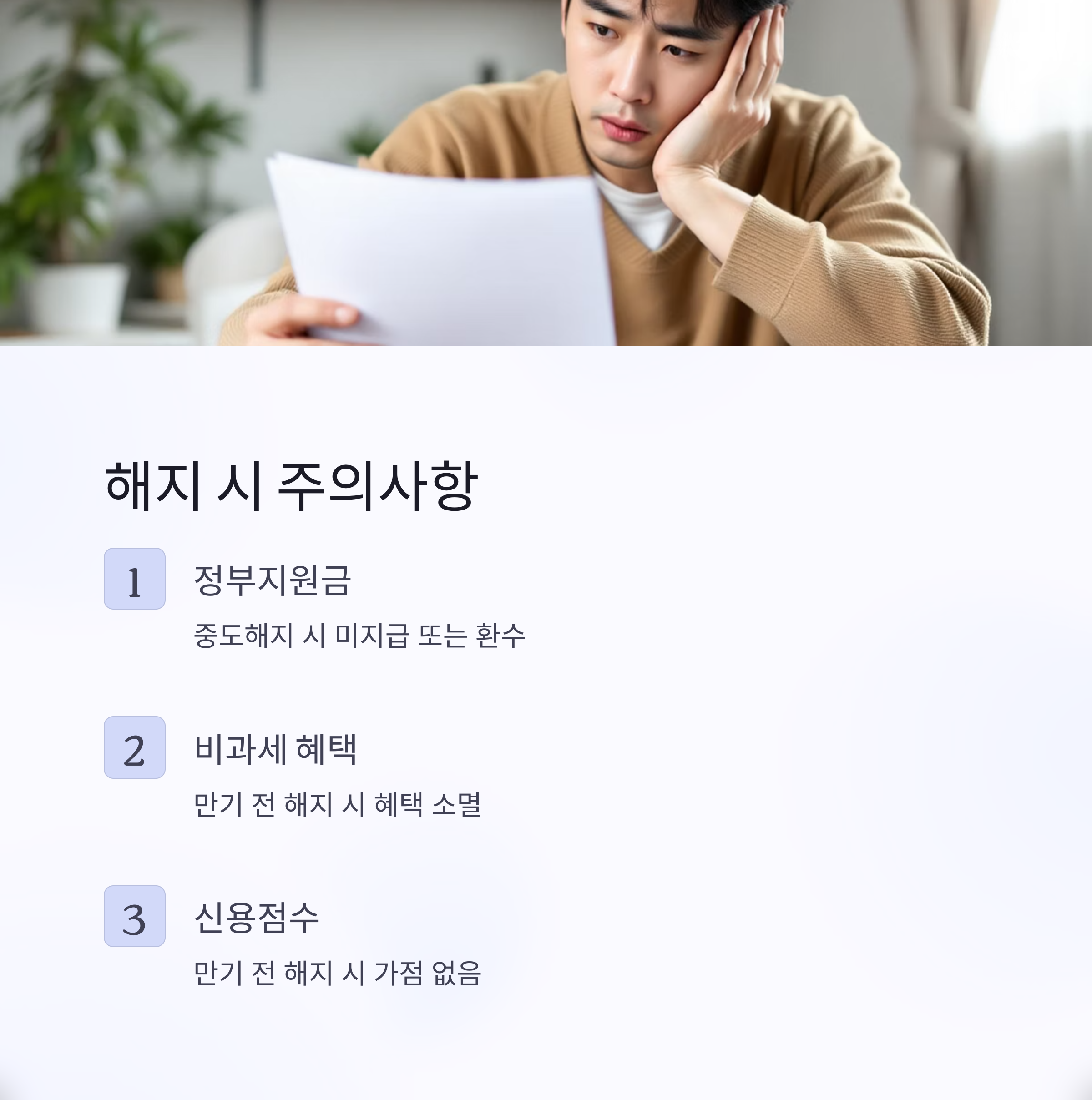 중도해지는 가능하지만, 정부지원금은 지급되지 않거나 환수될 수 있습니다. 특히 만기 전 해지 시 비과세 혜택과 신용점수 가점도 받을 수 없습니다.