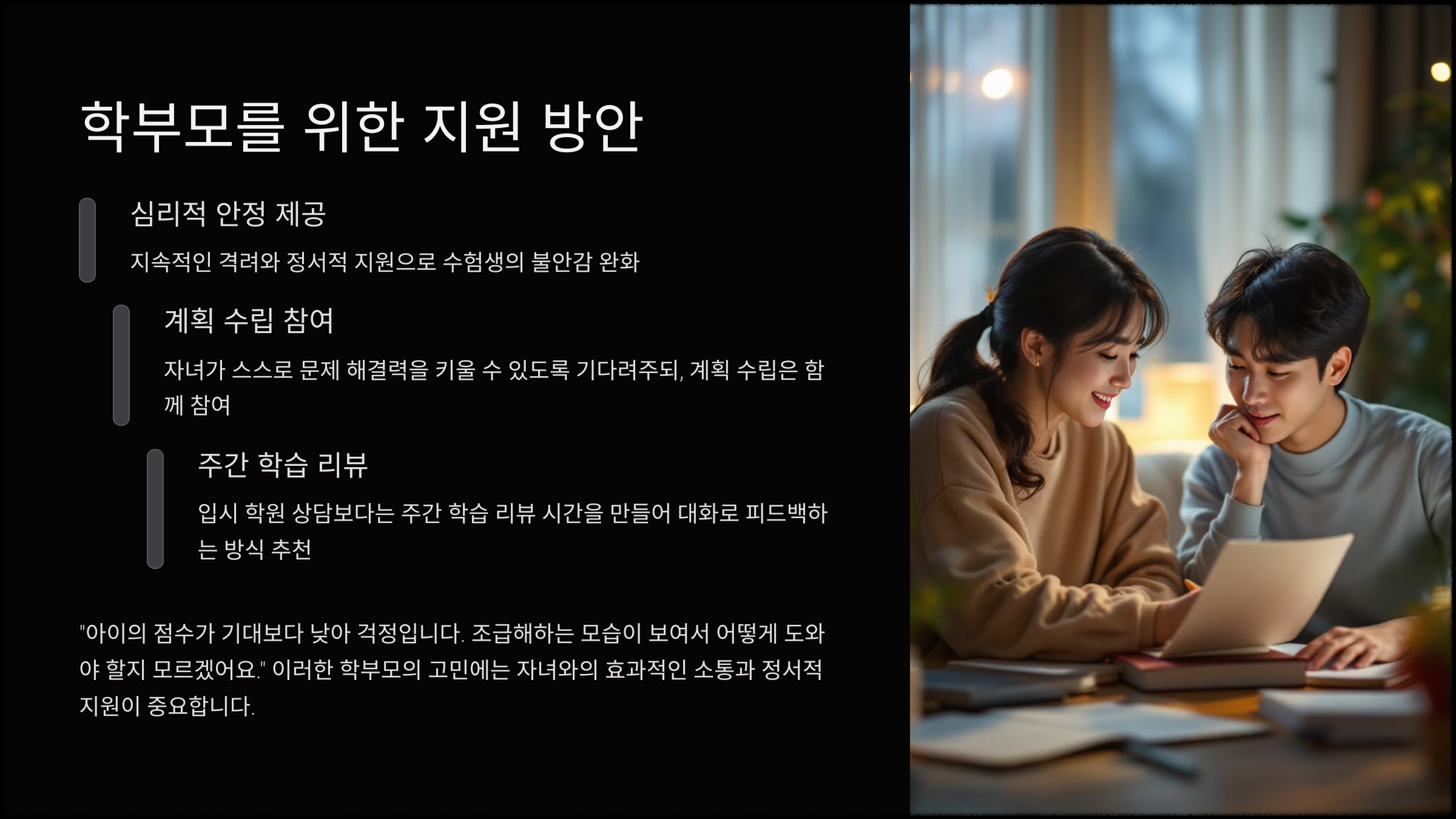 학부모들은 자녀의 학습 환경을 조성하고, 정서적인 지원을 제공하는 것이 중요합니다. 자녀와의 소통을 통해 학습 계획을 함께 세우고, 스트레스 관리에도 신경을 써야 합니다.