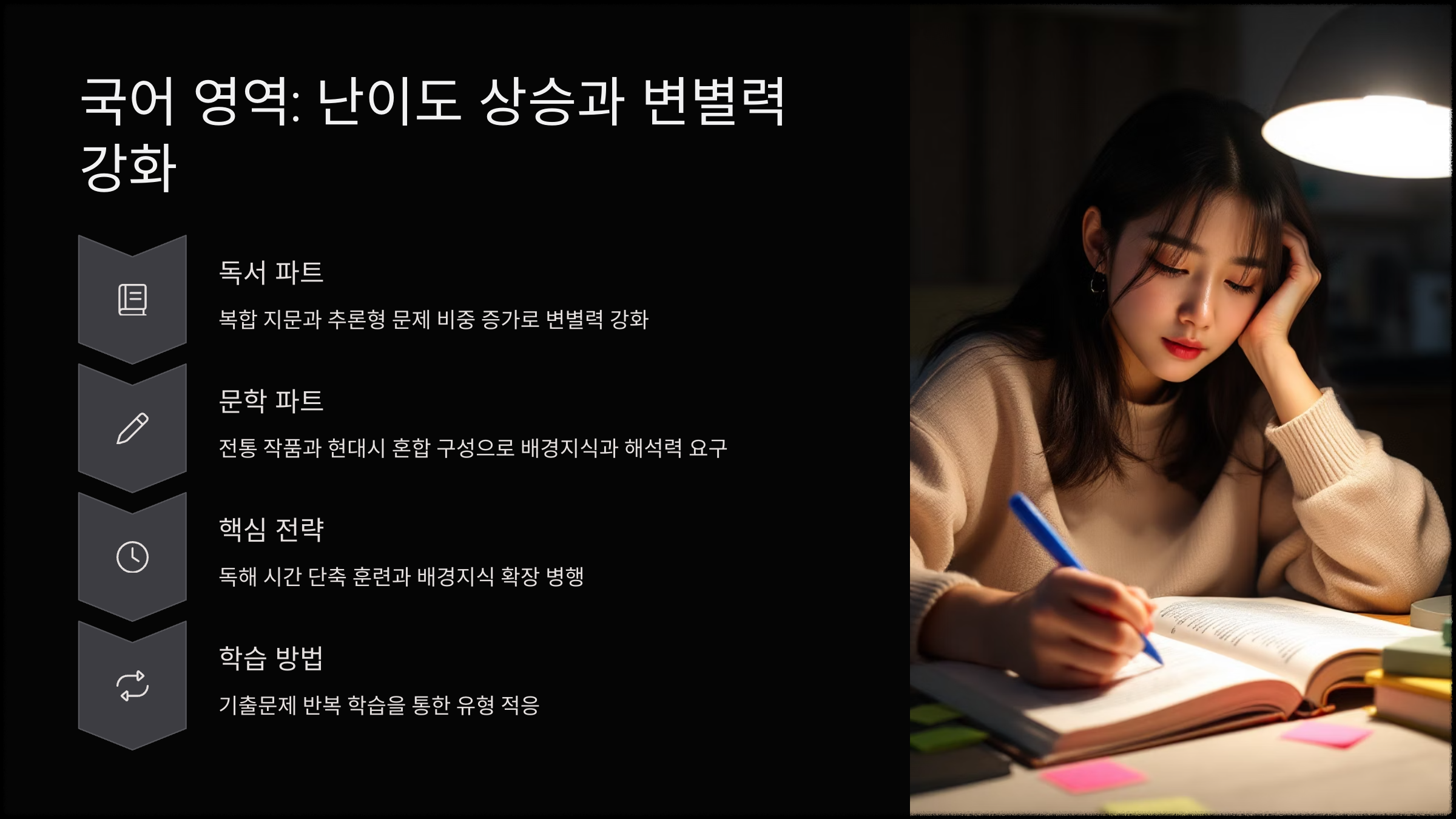 핵심 전략: 독해 시간 단축 훈련과 배경지식 확장이 반드시 병행되어야 하며, 기출문제 반복 학습을 통한 유형 적응이 중요합니다.