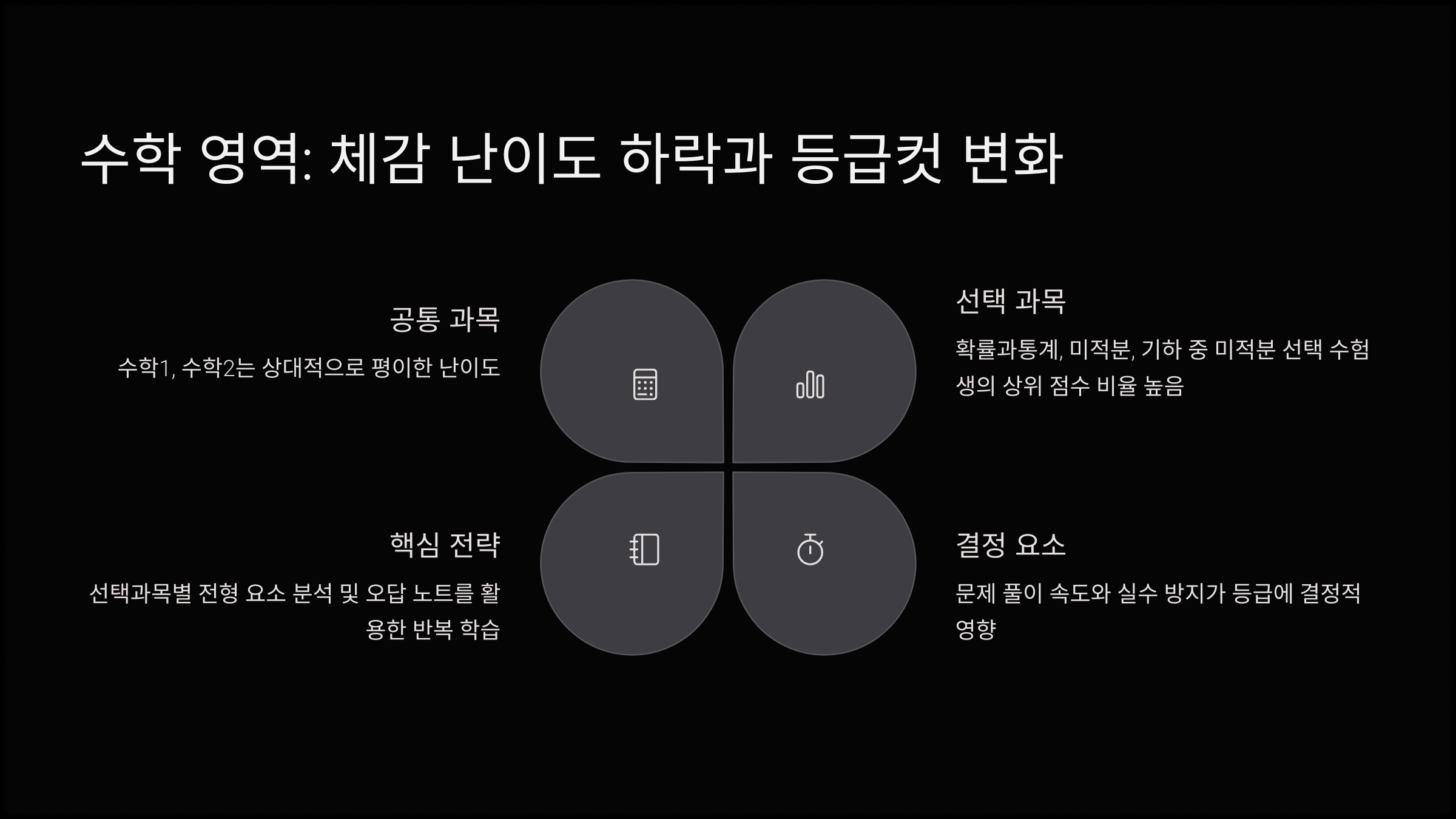 핵심 전략: 선택과목별 전형 요소 분석 및 실수 방지를 위한 훈련 필요. 오답 노트를 활용한 반복 학습이 필수입니다.
