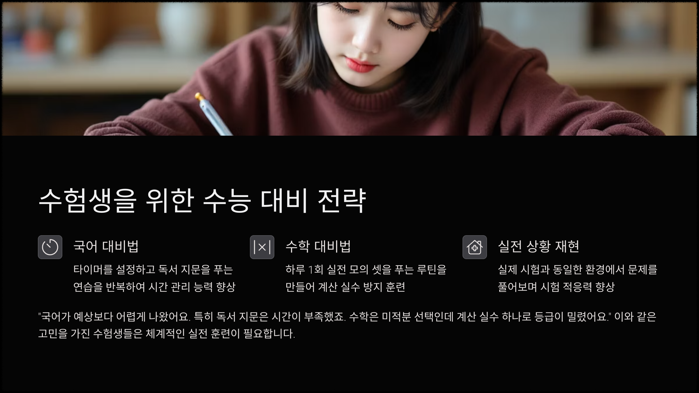 밀렸어요." 이와 같은 고민을 가진 수험생은 실전 상황 재현 학습이 필요합니다. 국어는 타이머를 설정하고 독서 지문을 푸는 연습을 반복해야 하며, 수학은 하루 1회 실전 모의 셋을 푸는 루틴을 만들면 효과적입니다. 수험생들은 여러 방법을 실험해보고 본인에게 잘 맞는 방법을 빨리 찾아 이것을 반복 학습하는게 성적을 빨리 올릴 수 있는 최선의 방법이라고 생각합니다