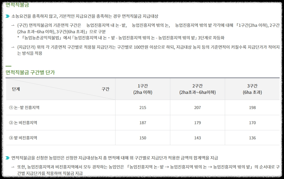| 농지 요건 | 직불금 지급 가능 농지로 등록된 면적 (최소 0.1ha 이상) |