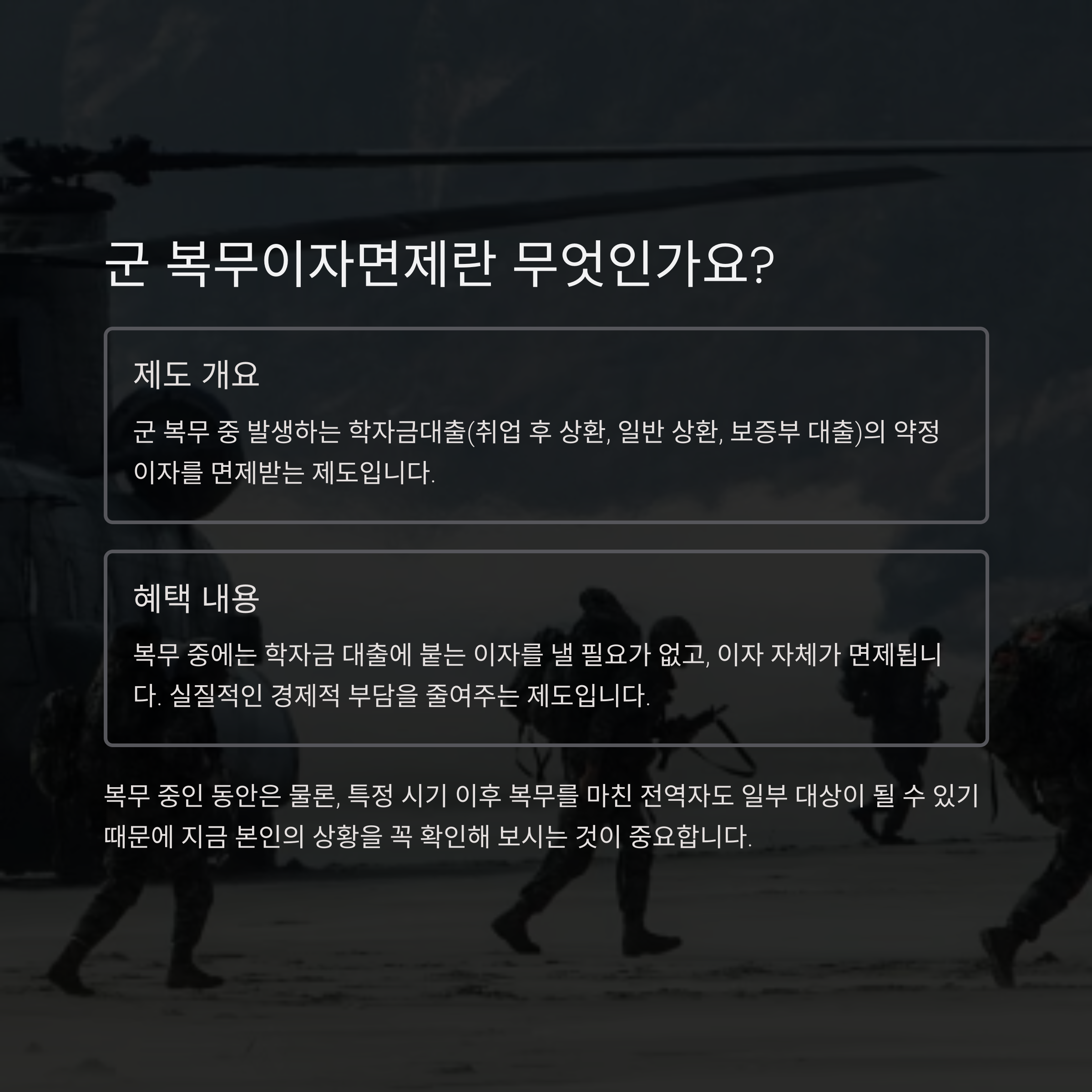 이 제도는 국방의 의무를 성실히 이행하는 청년들이 복무 기간 동안 부담되는 학자금대출 이자를 면제받을 수 있도록 마련된 국가정책입니다. 놓치면 손해이고, 알면 혜택이 돌아오는 확실한 제도입니다.