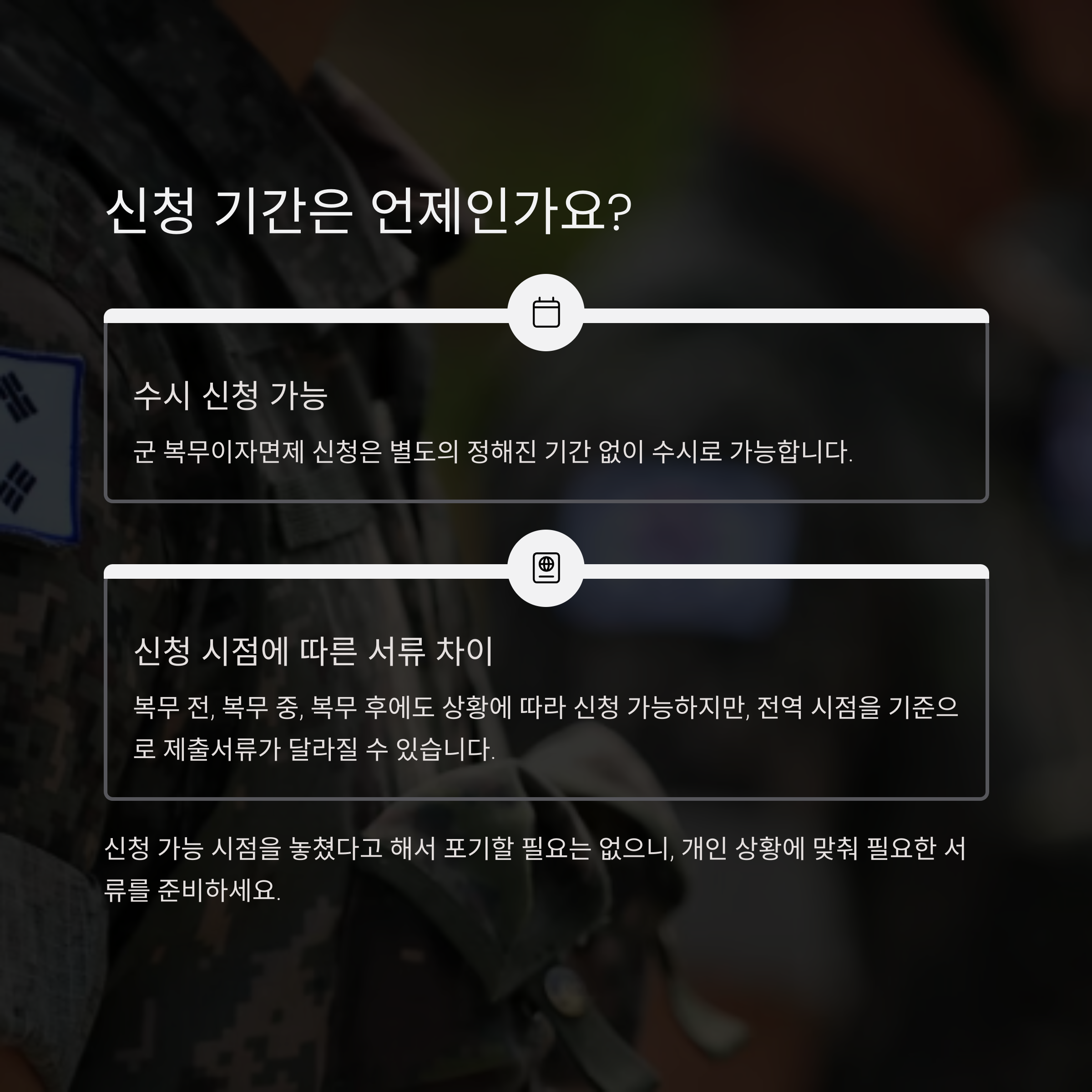 단, 신청일 이전부터 복무 중이거나, 복무가 종료된 경우에는 전역 시점을 기준으로 제출서류가 달라질 수 있으니 개인 상황에 맞춰 준비해야 합니다.