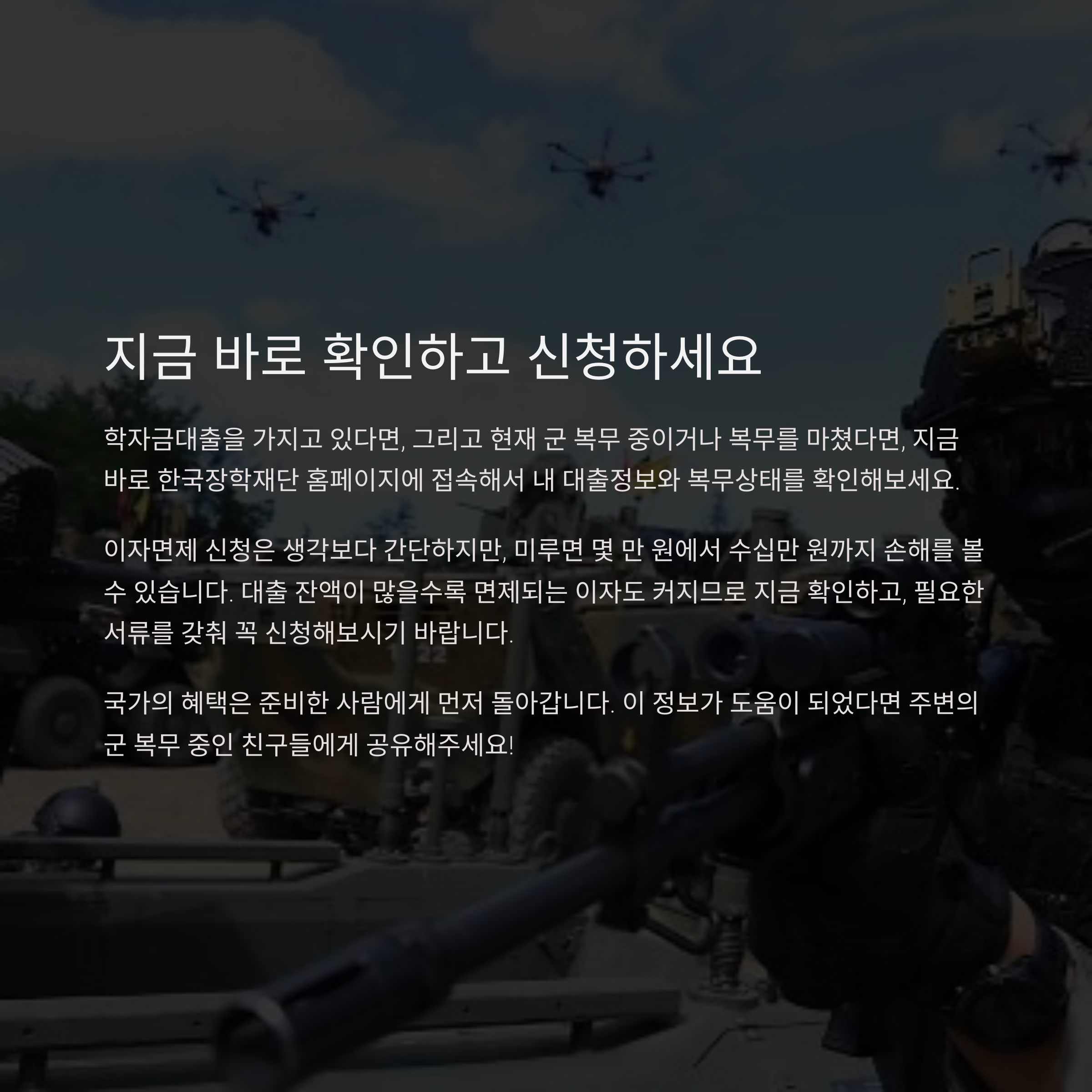 학자금대출을 가지고 있다면, 그리고 현재 군 복무 중이거나 복무를 마쳤다면, 지금 바로 한국장학재단 홈페이지에 접속해서 내 대출정보와 복무상태를 확인해보세요.