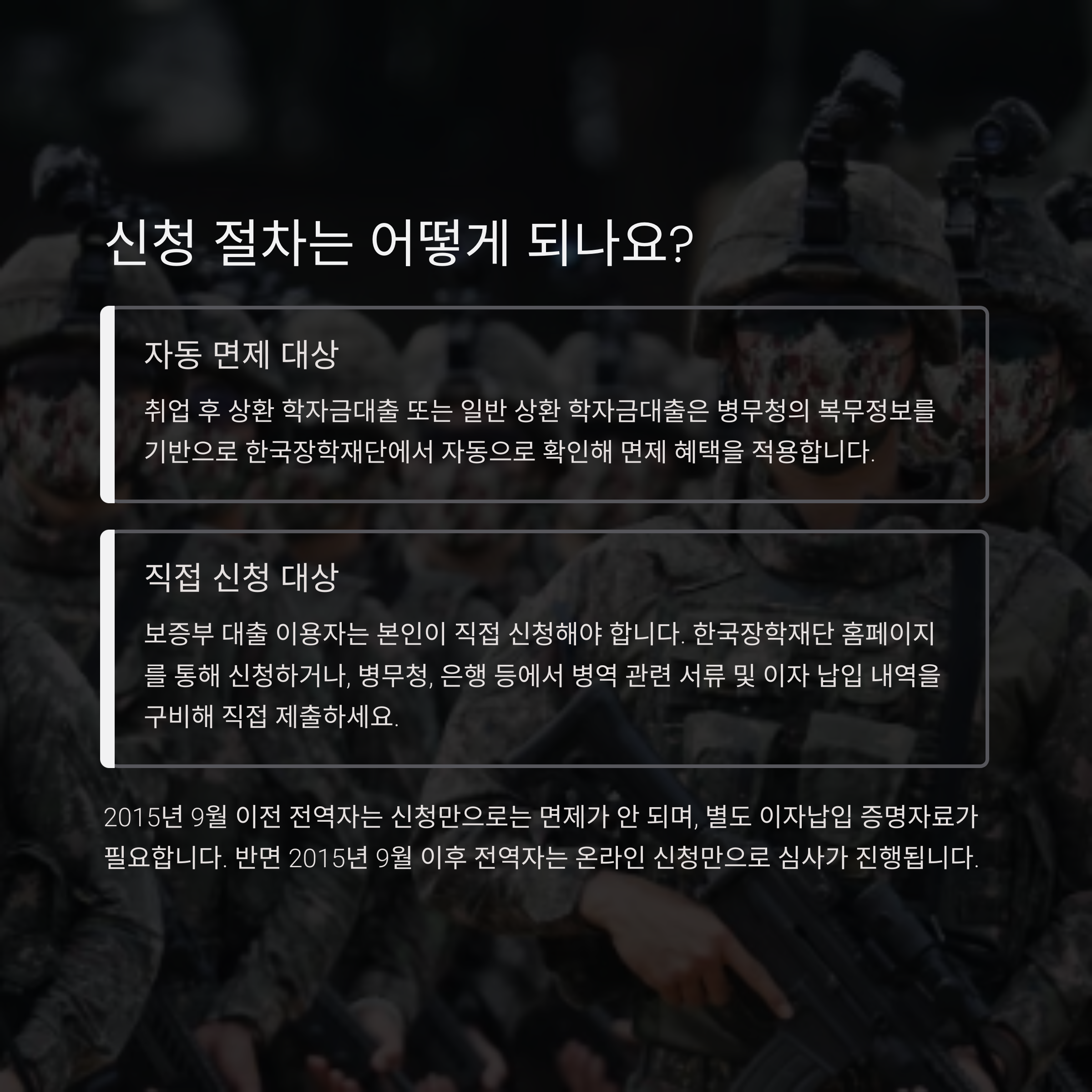 신청은 따로 하지 않아도 됩니다. 병무청의 복무정보를 기반으로 한국장학재단에서 자동으로 확인해 면제 혜택을 적용합니다. - 보증부 대출 이자면제