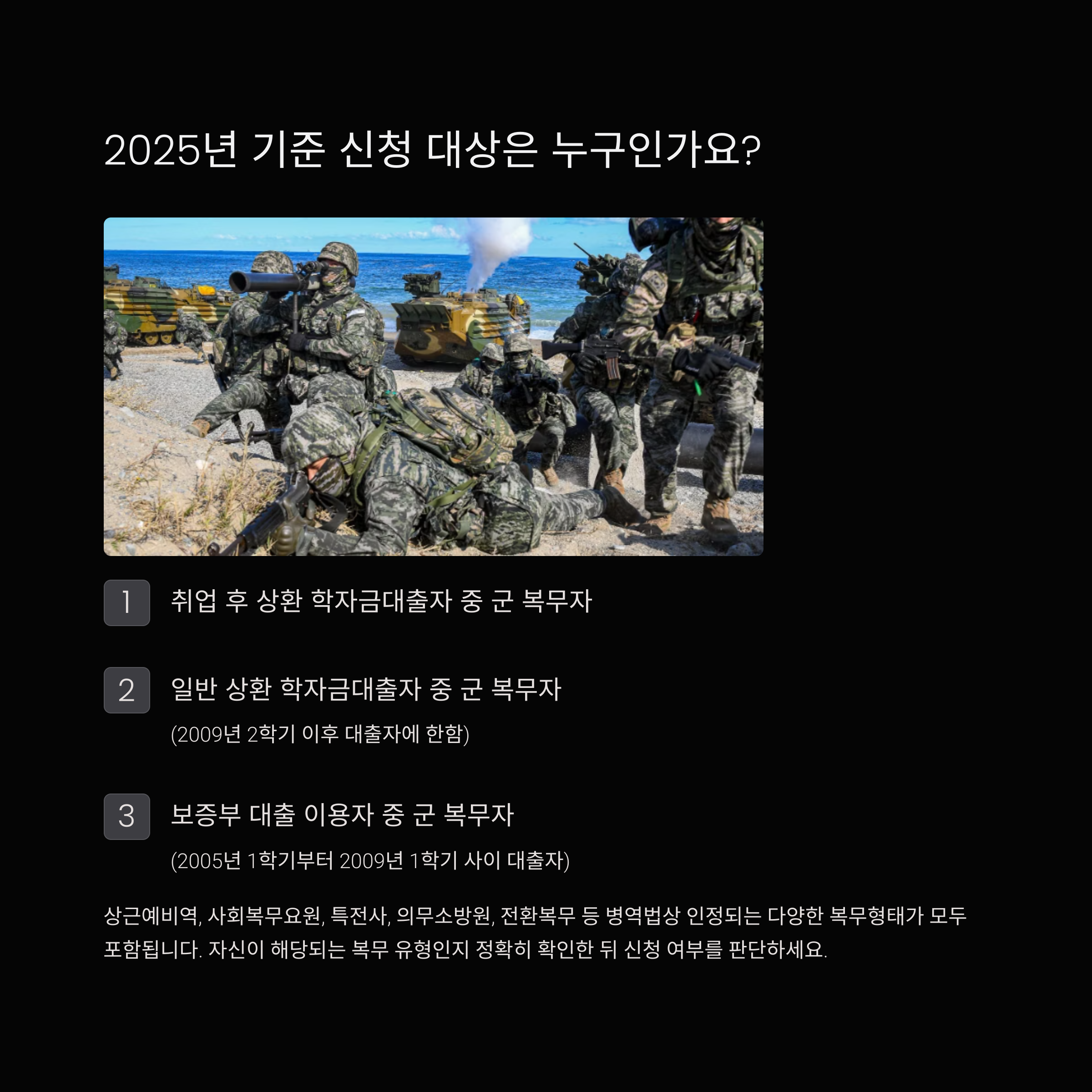 - 일반 상환 학자금대출자 중 군 복무자 (2009년 2학기 이후 대출자에 한함)