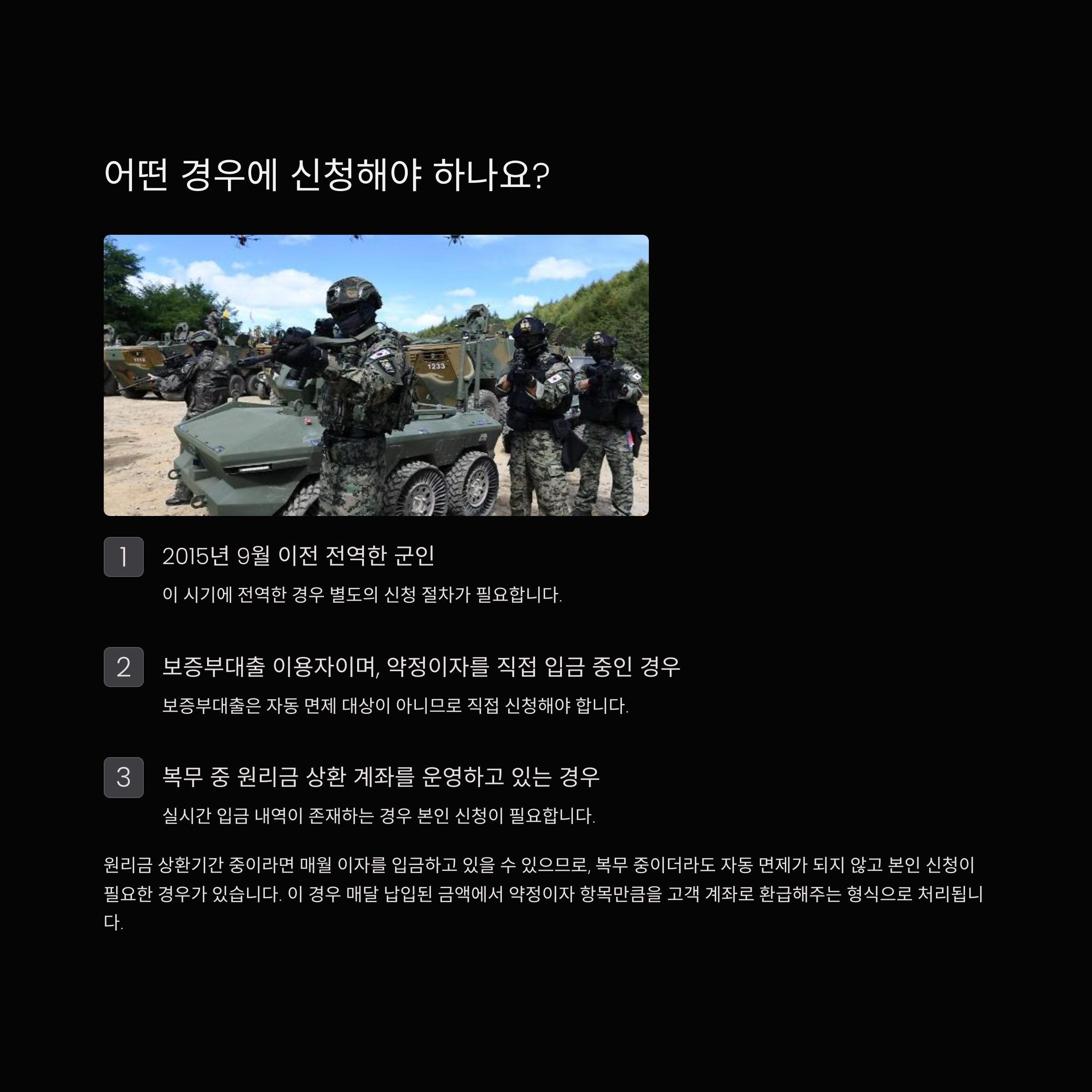 대출자가 군 복무 중이거나 복무를 마친 후 아래 조건 중 하나에 해당된다면 직접 신청을 해야 합니다.