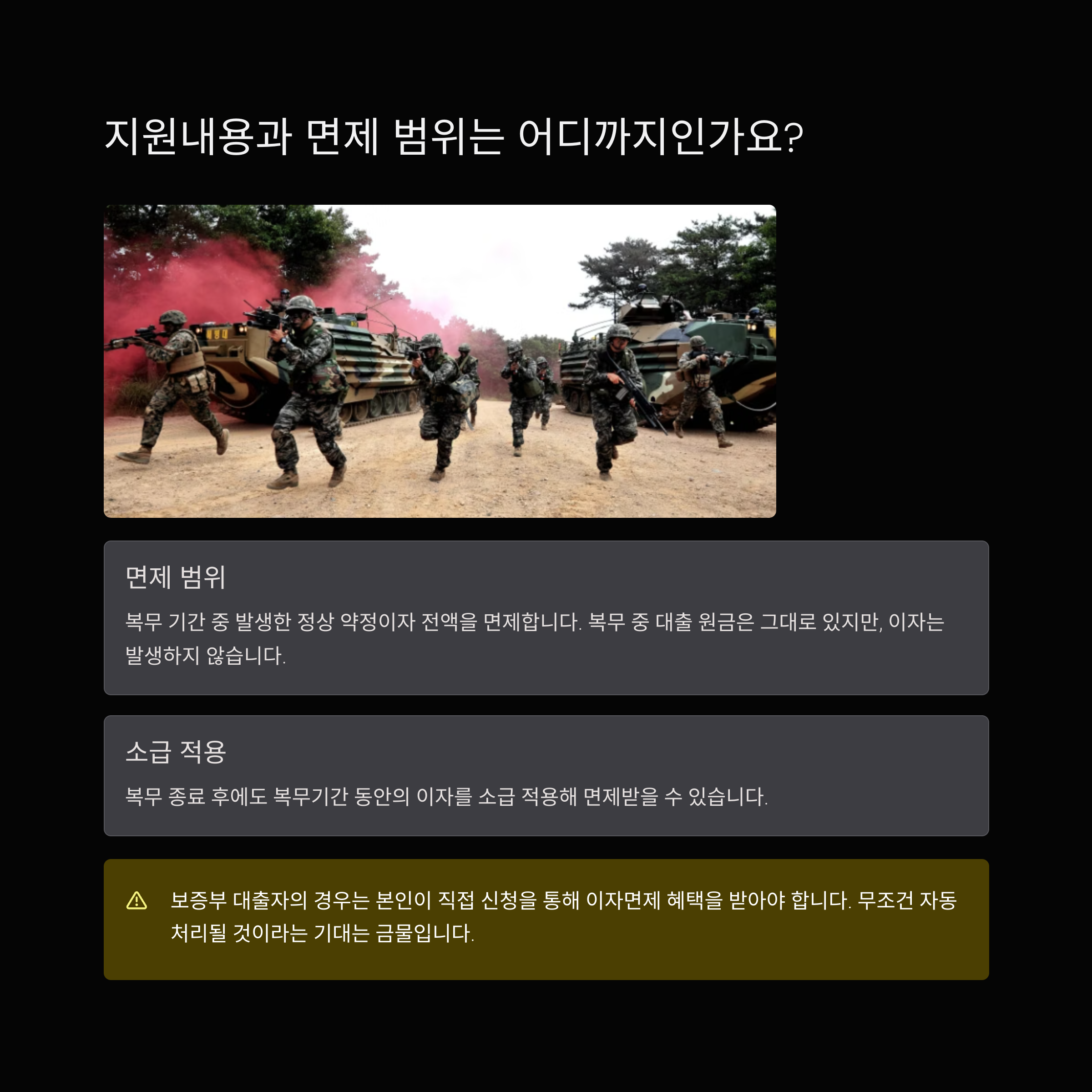 지원은 복무 기간 중 발생한 정상 약정이자 전액을 면제하는 방식입니다. 다시 말해 복무 중 대출 원금은 그대로 있지만, 이자는 발생하지 않으며, 복무 종료 후에도 복무기간 동안의 이자를 소급 적용해 면제받을 수 있습니다.