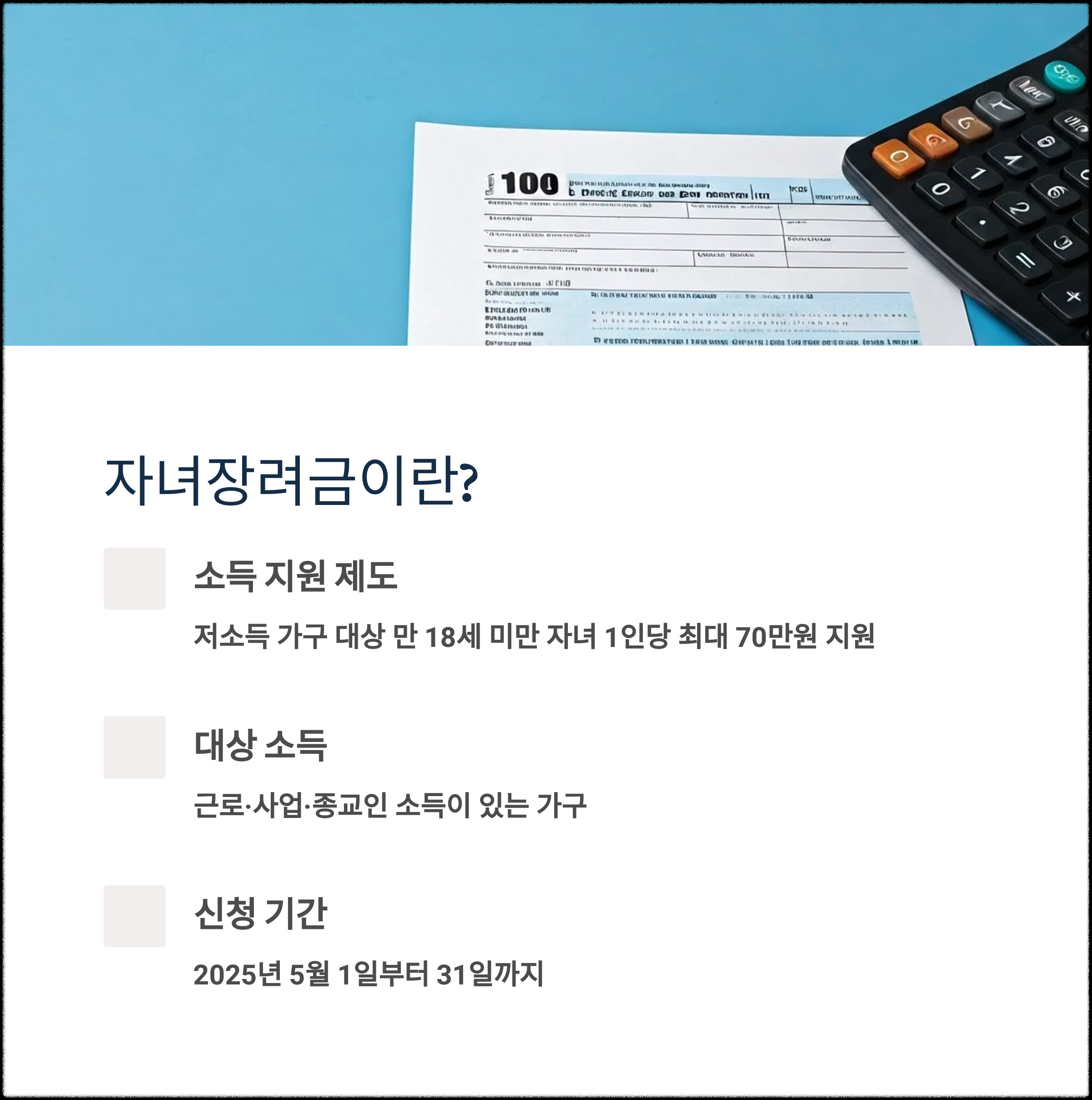 자녀가 있고 소득이 기준 이내라면 반드시 챙겨야 할 혜택입니다.