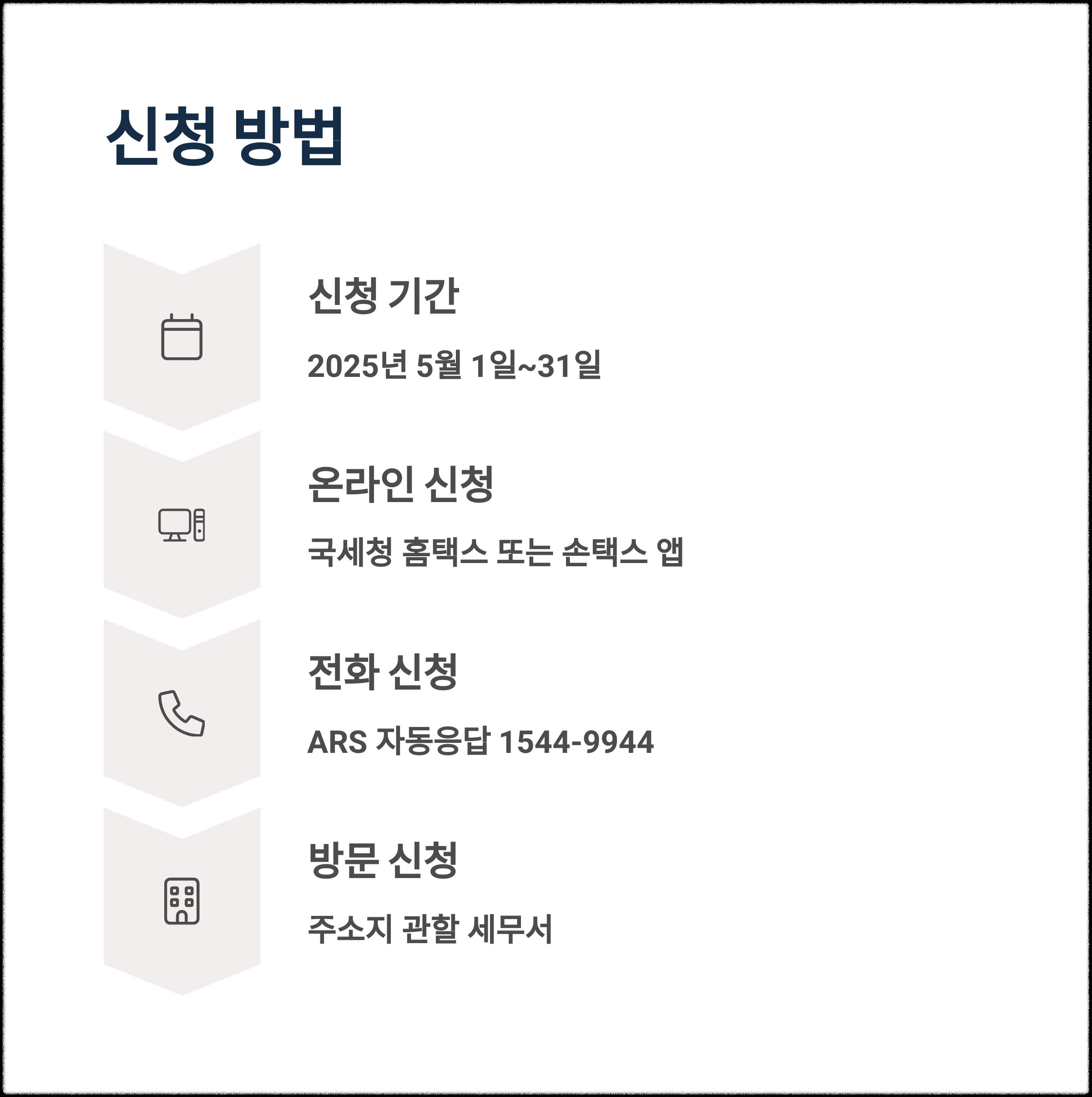 2025년에도 작년과 마찬가지로 국세청 홈택스 또는 모바일 앱을 통해 5월 한 달간 신청을 받습니다.