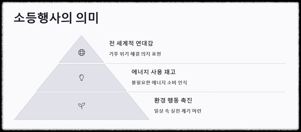 소등행사는 단순히 에너지를 절약하는 차원을 넘어선다. 전 세계가 동시에 조명을 끄며 보여주는 연대감은 기후 위기를 해결하기 위한 집단적인 의지를 표현하는 강력한 메시지다.
