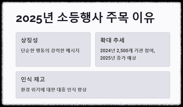 2024년에는 전국적으로 약 2,500개 기관이 소등행사에 참여했으며, 2025년에는 이보다 더 많은 참여가 예상되고 있다. 이 같은 행사는 단순한 전기절약을 넘어서, 환경 위기에 대한 대중의 인식 제고와 실질적인 행동 변화를 촉구하는 중요한 계기가 되고 있다.