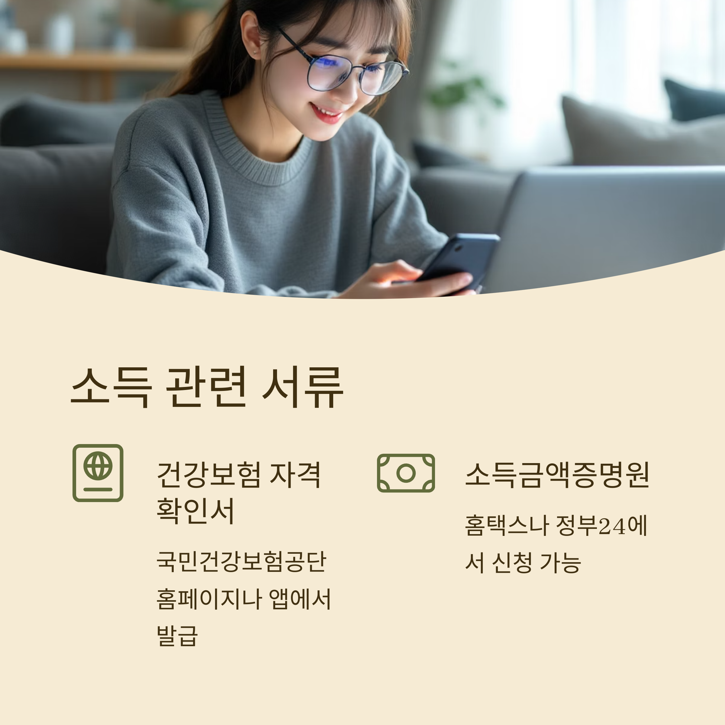 소득 관련 확인 서류: 건강보험 자격확인서 및 소득금액증명원