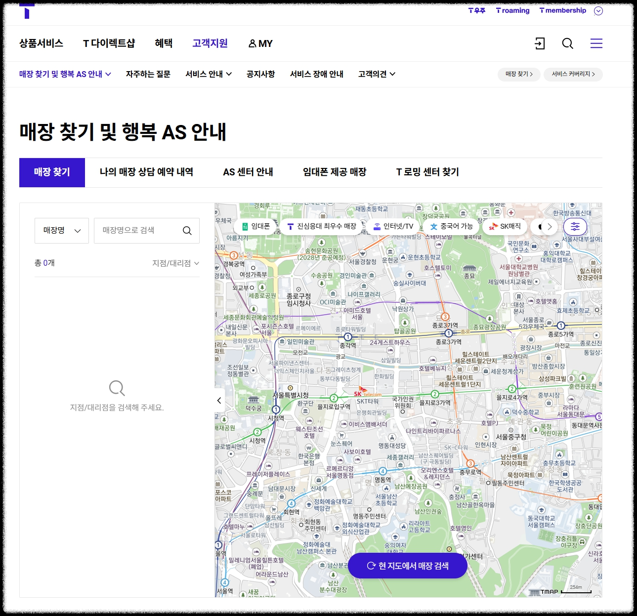 T월드 앱 로그인 => 우측상단 매장찾기 클릭 => 좌측상단 매장명 입력
